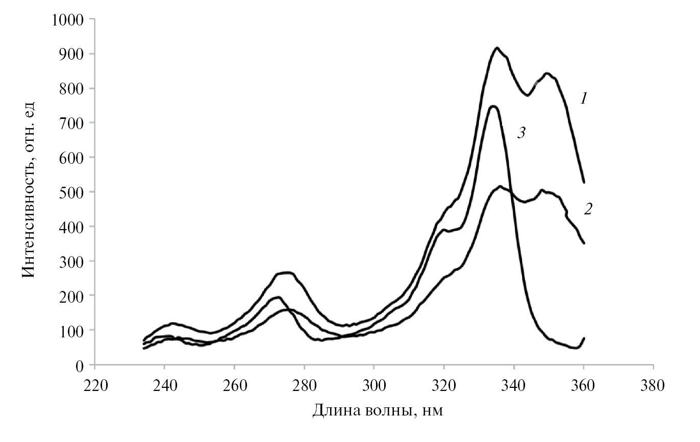 Рис. 2. Спектры возбуждения флуоресценции систем, содержащих молекулы пирена (5.0×10–8 М) в присутствии водных растворов цетилтриметиламмоний бромида (ЦТМА) и аквазоля серебра различных концентраций, полученные при разных длинах волн наблюдения свечения. 1 − концентрация ЦТМА 1.5 мМ, концентрация аквазоля серебра 1.0 ×10–6 М при λфл = 425 нм; 2 − концентрация ЦТМА 0.5 мМ, концентрация аквазоля серебра 1.0×10–6 М при λфл = 470 нм; 3 − концентрация ЦТМА 1.5 мМ, в отсутствие аквазоля серебра при λфл = 425 нм.