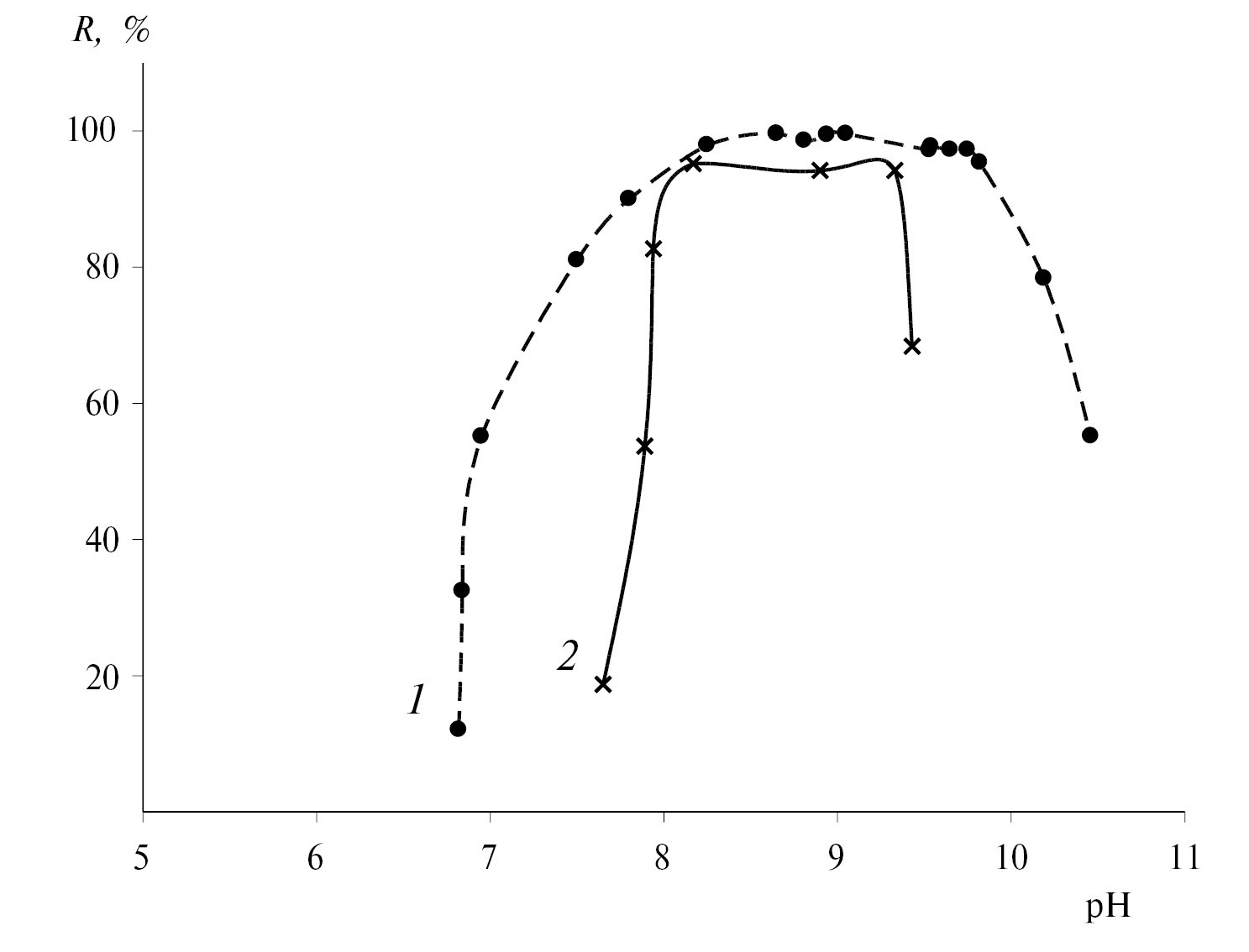 Ранее показано, что N-нонаноил-N'-метансульфонилгидразин (НМГ) образует с ионами цветных металлов малорастворимые осадки. Его применение в качестве собирателя в процессе ИФ обеспечивает получение высокой степени извлечения ЦМ (95−99%) при их совместном присутствии, а также отделение меди от сопутствующих ионов в области значений рН 5−6.5 [20]. Частным случаем селективного выделения меди является разделение меди и цинка. Установили (рис. 1, кривая 2), что исходная концентрация металлов влияет на их индивидуальную флотацию по-разному. Для цинка увеличение его концентрации приводит к более резкому повышению степени извлечения; для меди – к расширению интервала оптимальных значений рН флотации (рис. 2). Коэффициенты распределения металлов, приведенные в табл. 1, указывают на более эффективное извлечение Zn(II) по сравнению с Cu(II). Максимальная степень извлечения для Cu(II) составила: 96.7% (рН 6.5−7.0) при сисх 12.3 мг/л и 97.8% (рН 6.0−7.0) при сисх 46.1 мг/л; для цинка – 97.7% (рН 8.4−9.1) и 99.5% (рН 8.6–9.4) при сисх 14.8 и 41.0 мг/л соответственно.