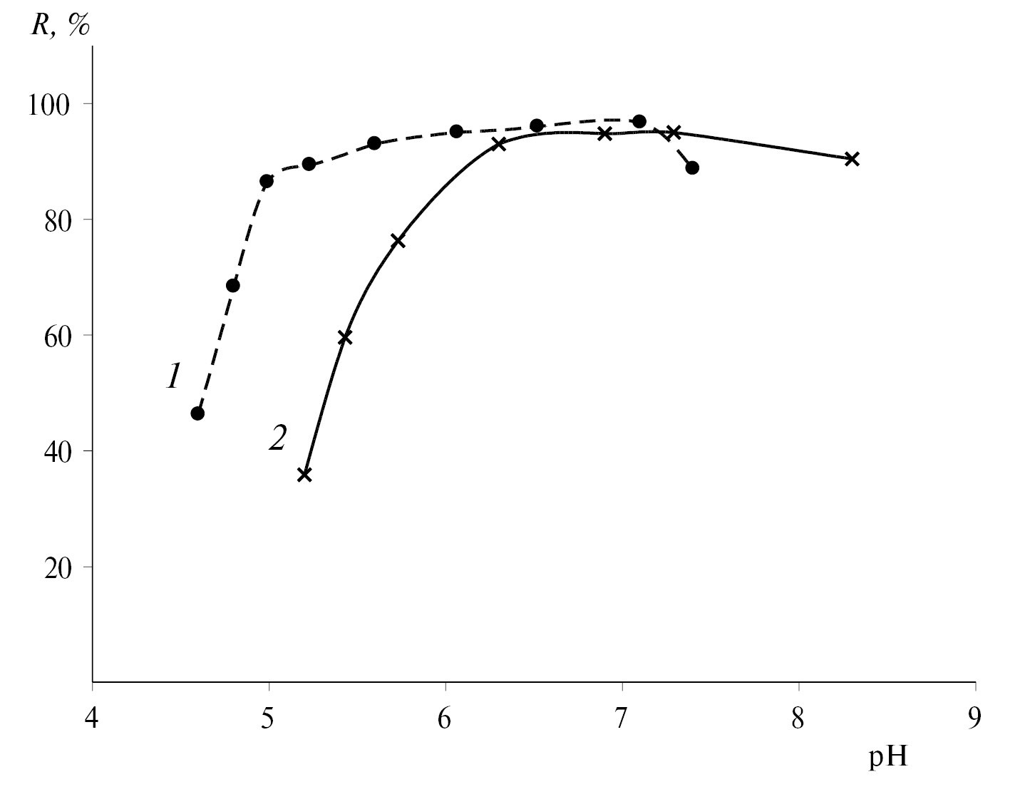 Рис. 1. Зависимость степени флотационного извлечения ионов Zn(II) от рНравн ∙ cZn(исх), мг/л: 1 – 41.0, 2 – 14.8; [Zn(II)] : [МНГ] = 1 : 1; τконд = 30 мин, τфл = 10 мин.