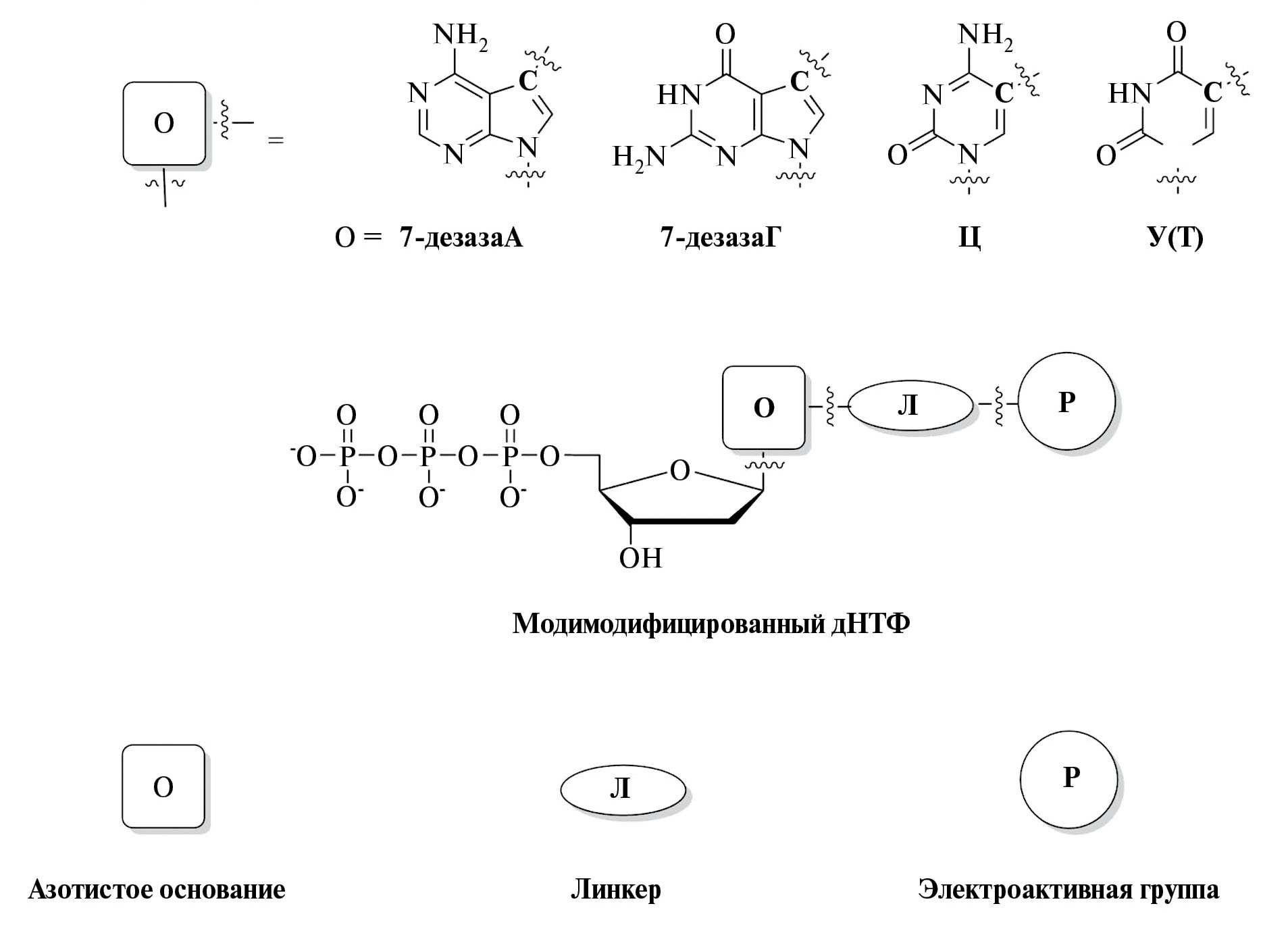 Основной задачей многих экспериментальных работ стало получение новых модифицированных нуклеотидов и изучение их электрохимических свойств с целью выбора метки, способной окисляться или восстанавливаться при наиболее низких положительных или отрицательных потенциалах с высокой аналитической чувствительностью для последующего определения концентрации ДНК или регистрации нуклеотидных замен и мутаций [74, 76, 77, 78, 103]. При этом сигнал введенной метки может накладываться на сигналы остатков Г и/или А в ДНК-олигонуклеотидах, чего лучше избегать. Кроме того, желательно, чтобы встроенная метка давала только один четкий пик окисления или восстановления без каскада электрохимических превращений. При выборе метки немаловажное значение имеет, обладает ли новая группа интеркалирующим эффектом в ДНК. Например, остатки тирозина и триптофана не включены в список интеркаляторов ДНК, в отличие от метиленового синего [73] или комплексов катионов металлов с полициклическими ароматическими лигандами [79]. На практике выбор четырех элетроактивных групп, дающих при совместном присутствии раздельные сигналы на вольтамперограмме, является непростой задачей. Одновременно проводят биохимические исследования с целью выяснить, насколько хорошим субстратом ДНК- или РНК-полимераз является искусственный нуклеотид по сравнению с природным, включая его в различные реакции амплификации.
