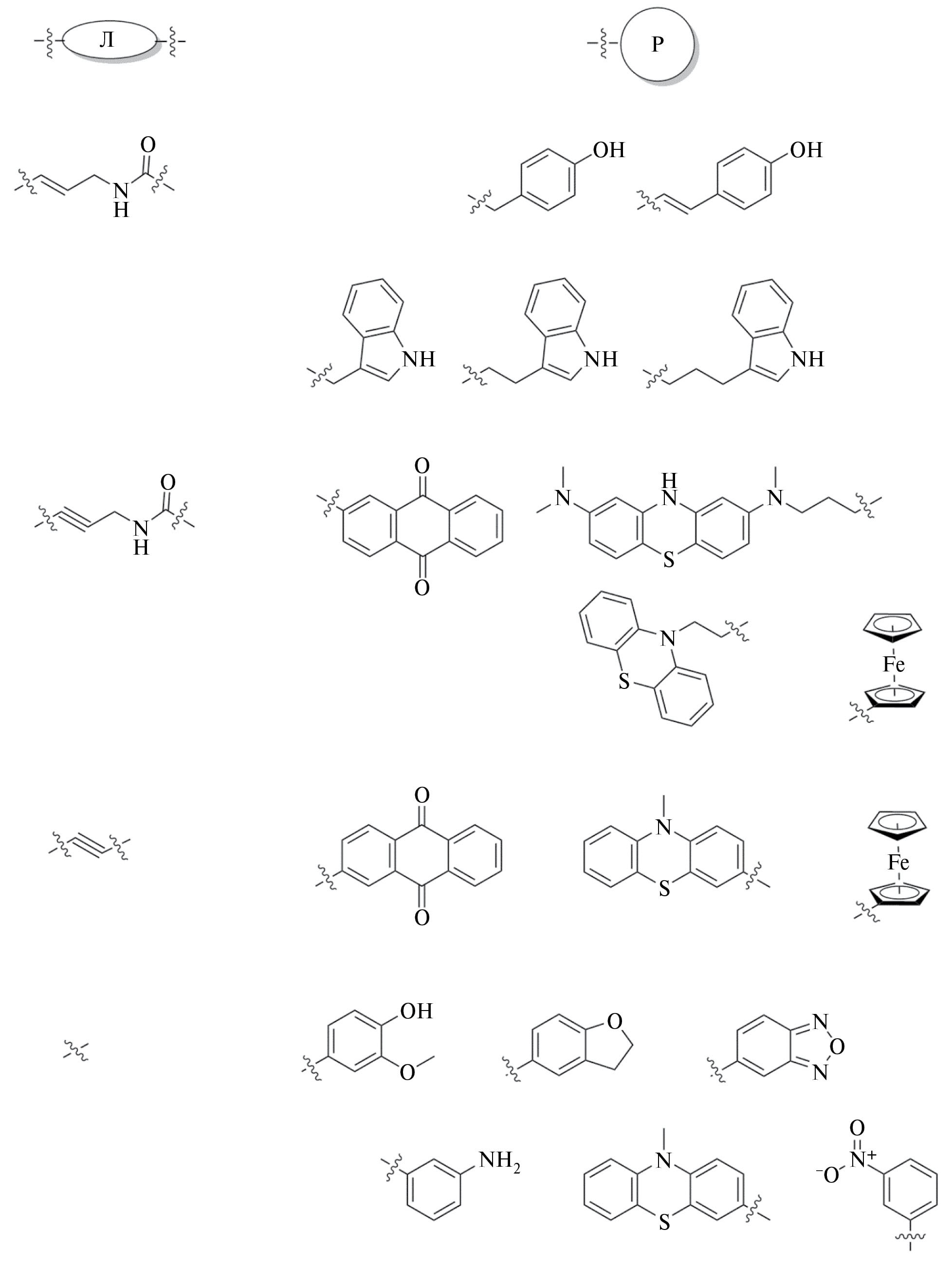 Рис. 2. Разнообразие электроактивных групп и линкеров в синтетических модифицированных нуклеотидах: ферроцен [74–77, 103–105], антрахинон [83, 91], 4-гидрокси-3-метоксифенил и 2,3-дигидробензофуран-5-ил [84], фенотиазин [85], остатки тирозина и триптофана [88, 89], 3-аминофенил и 3-нитрофенил [87, 106], бензофуразан [98]. Л – линкер, Р – электроактивная функциональная группа.