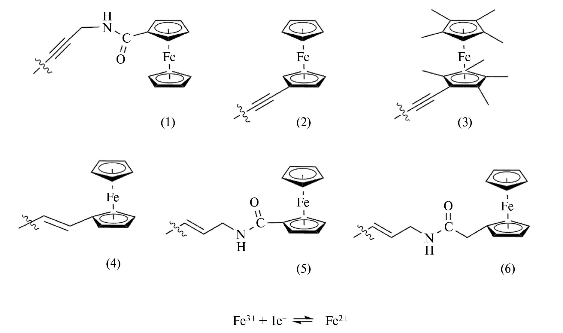 Рис. 4. Ферроцен и его производные в качестве электроактивных меток нуклеотидов: ферроценкарбоксамид (1), незамещенный ферроцен (2), октаметилферроцен (3), ферроценвинил (4), 5-(3-ферроценкарбоксамидопропенил-1) (5) и 5-(3-ферроценацетамидопропенил-1) (6), связанные линкером с атомом углерода С7 или С5 пуринового или пиримидинового азотистого основания нуклеотида (ДНК или РНК) соответственно [74–78, 103–109, 120]. Для модифицированных дУТФ от (1) к (3) [75], от (4) к (5) [106] и от (6) к (5) [108] значения потенциалов пиков окисления возрастают.