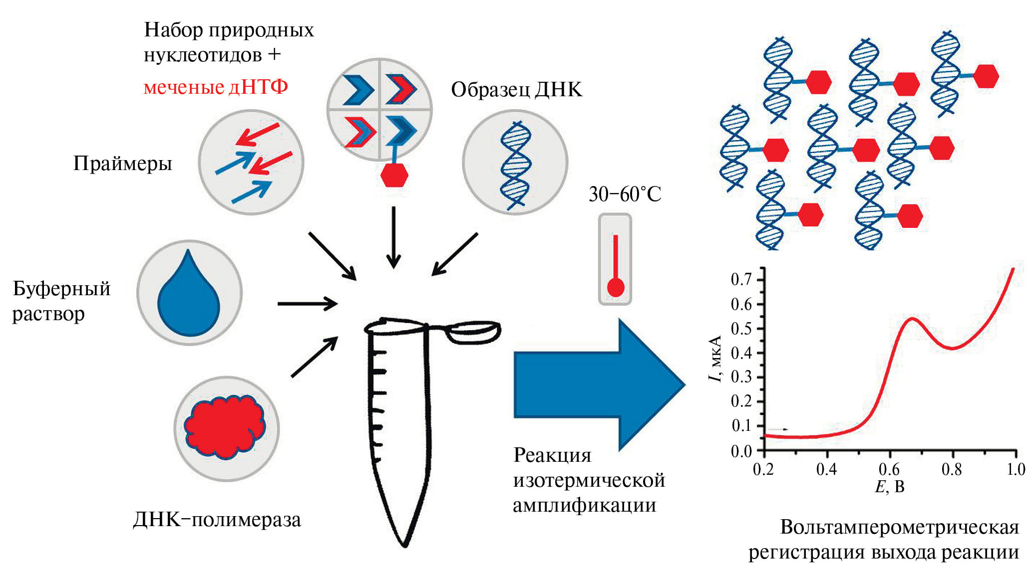 Рис. 5. Объединение реакции изотермической амплификации с внесением модифицированных нуклеотидов и вольтамперометрической регистрации выхода – путь к определению вирусного или бактериального заражения in situ.