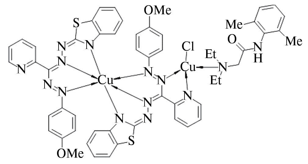 Из литературы известно [15], что гетарилформазаны с переходными металлами образуют внутрикомплексные соединения с октаэдрическим строением металл-хелатного узла, в котором катион металла связан с двумя анионными фрагментами формазана. В структуре CuОК также два аниона формазана (L−Н) связаны с Cu(II). Взаимодействие формазанов с солями меди, наряду с образованием комплекса, иногда сопровождается окислением части формазанов в соль тетразолия с восстановлением Cu(II) в Cu(I) [20]. Наличие метоксигруппы как сильного электронного донора в формазане способствует протеканию такого побочного процесса. В этом случае образующийся хлорид Cu(I) способен образовывать координационные связи по атому азота пиридинового и формазанового фрагментов, что приводит к возникновению структуры CuОК, представленной на схеме 2.