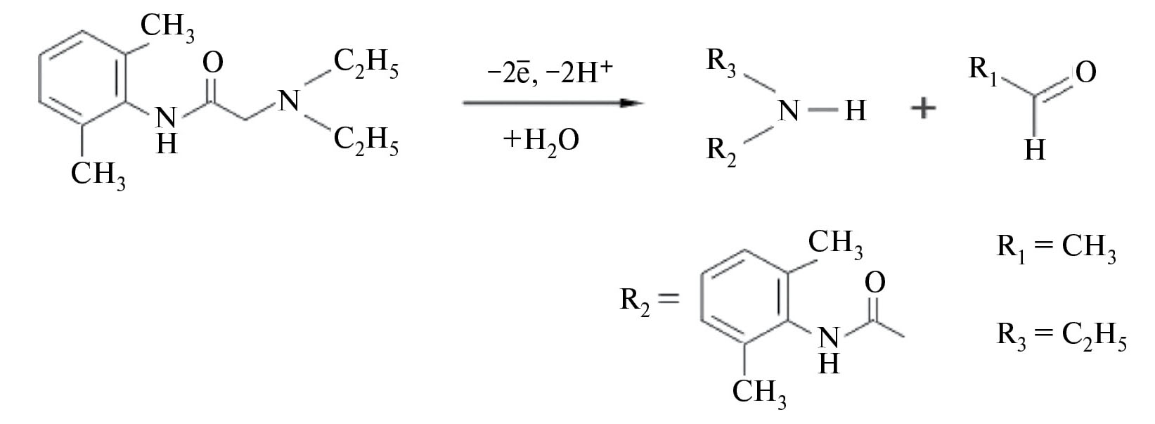 Электроактивными центрами в молекуле лидокаина являются третичный атом азота с алкильными заместителями и амидная группа. Рахбар и соавт. [25] убедительно показали, что электрохимическое окисление молекулы лидокаина происходит с большей вероятностью по аминогруппе, чем по амидной. Нури-Нигже и соавт. [26] предположили, что окисление лидокаина на аноде протекает по диэтиламиногруппе с отщеплением электронов через возможное образование катион-радикала, иминиевого промежуточного продукта с последующим N-деалкилированием. Подобный механизм, вероятно, имеет место и в нашем случае (схема 4).