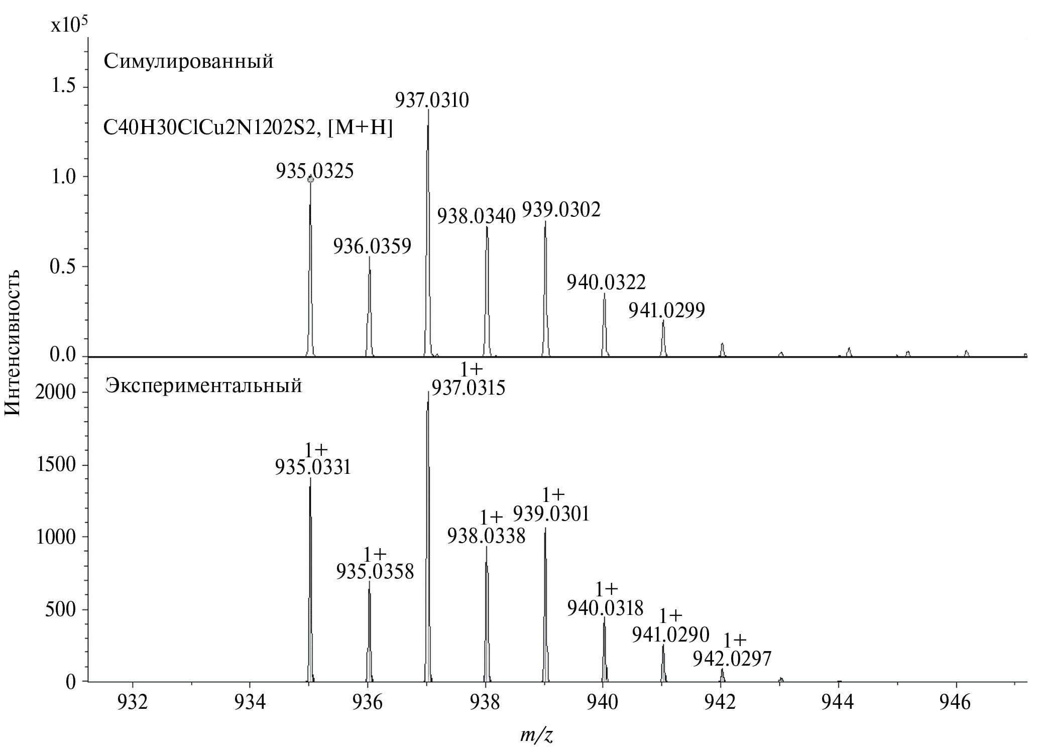 Из данных масс-спектрометрии найдено, что m/z (m – масса иона, z – заряд иона) составляет 935.0331 и соответствует молекулярному иону [M]+. Вычислено, m/z: 935.0336 для состава C40H30N12O2S2ClCu2 (рис. 2). По результатам элементного анализа установлено, что в состав металлокомплекса CuОК входит 51.29% C, 3.20% H, 17.94% N и 3.77% Cl.