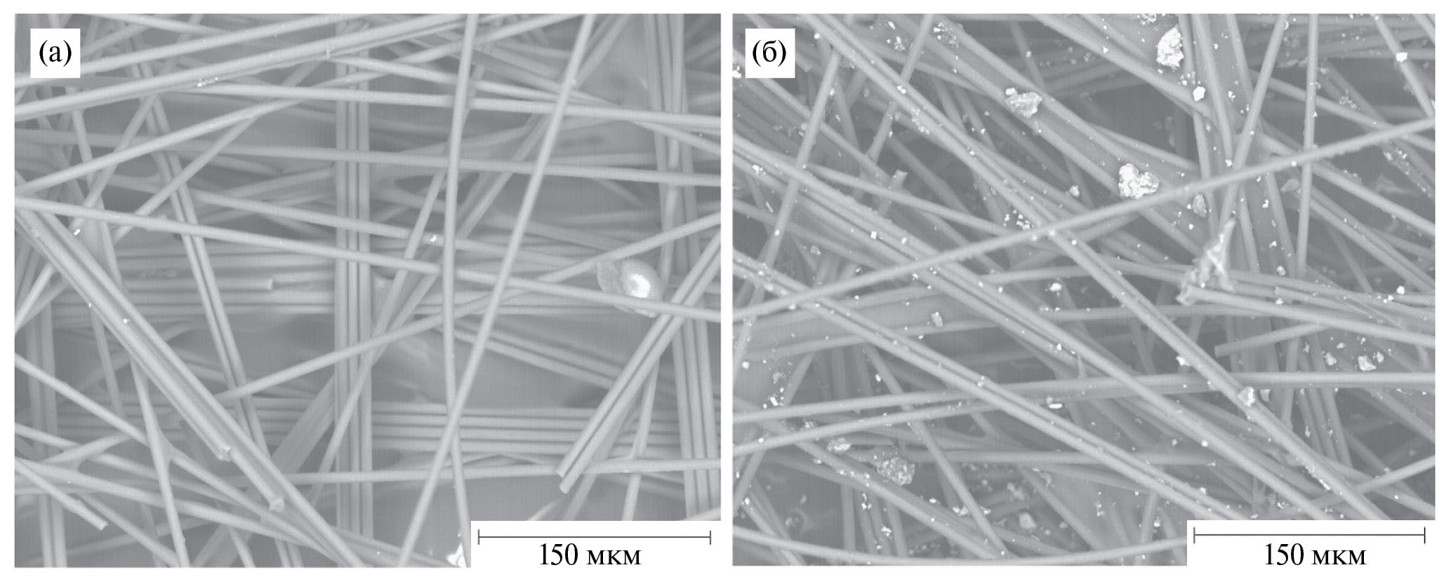 Рис. 3. СЭМ-изображения (а) немодифицированного электрода на основе углеволоконной бумаги (УВЭ) и (б) модифицированного Ш-CuОК/УВЭ. Ускоряющее напряжение 20 кВ в режиме рассеянных электронов.