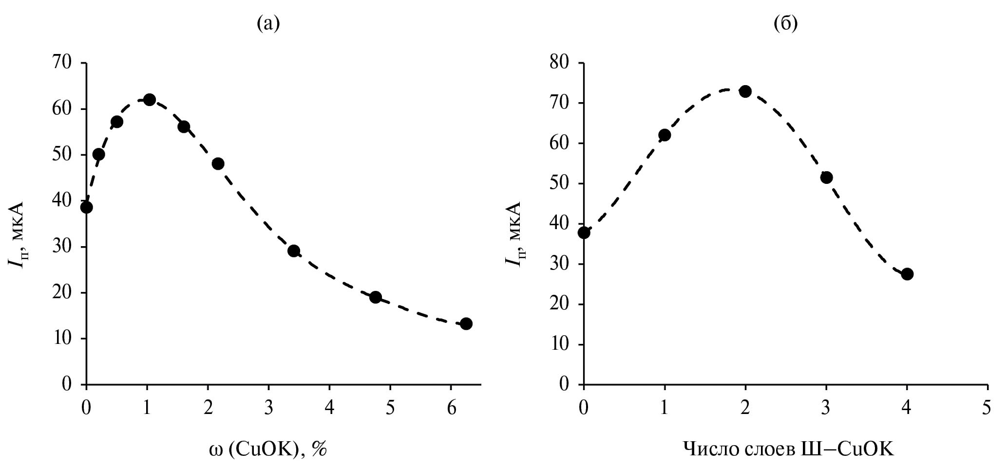 Выбор количества модификатора. Оптимальный состав композитного модификатора выбирали по величине тока пика окисления лидокаина (Iп). На рис. 4а приведена зависимость Iп от массовой доли CuOK в композитном модификаторе. Из зависимости Iп = f(ù(CuOK) (рис. 4а) видно, что при увеличении содержания металлорганического комплекса в композите до 1.04% происходит рост Iп. Содержание CuOK в композите свыше 1.04% приводит к спаду тока окисления лидокаина, что, вероятно, связано со снижением электропроводности модифицирующего слоя УВЭ. На рис. 4б приведена зависимость Iп от количества модифицирующих слоев, которая проходит через максимум, соответствующий двухслойному покрытию УВЭ композитным модификатором Ш-CuOK. В дальнейшем использовали двухслойное модифицирование при приготовлении рабочих электродов.