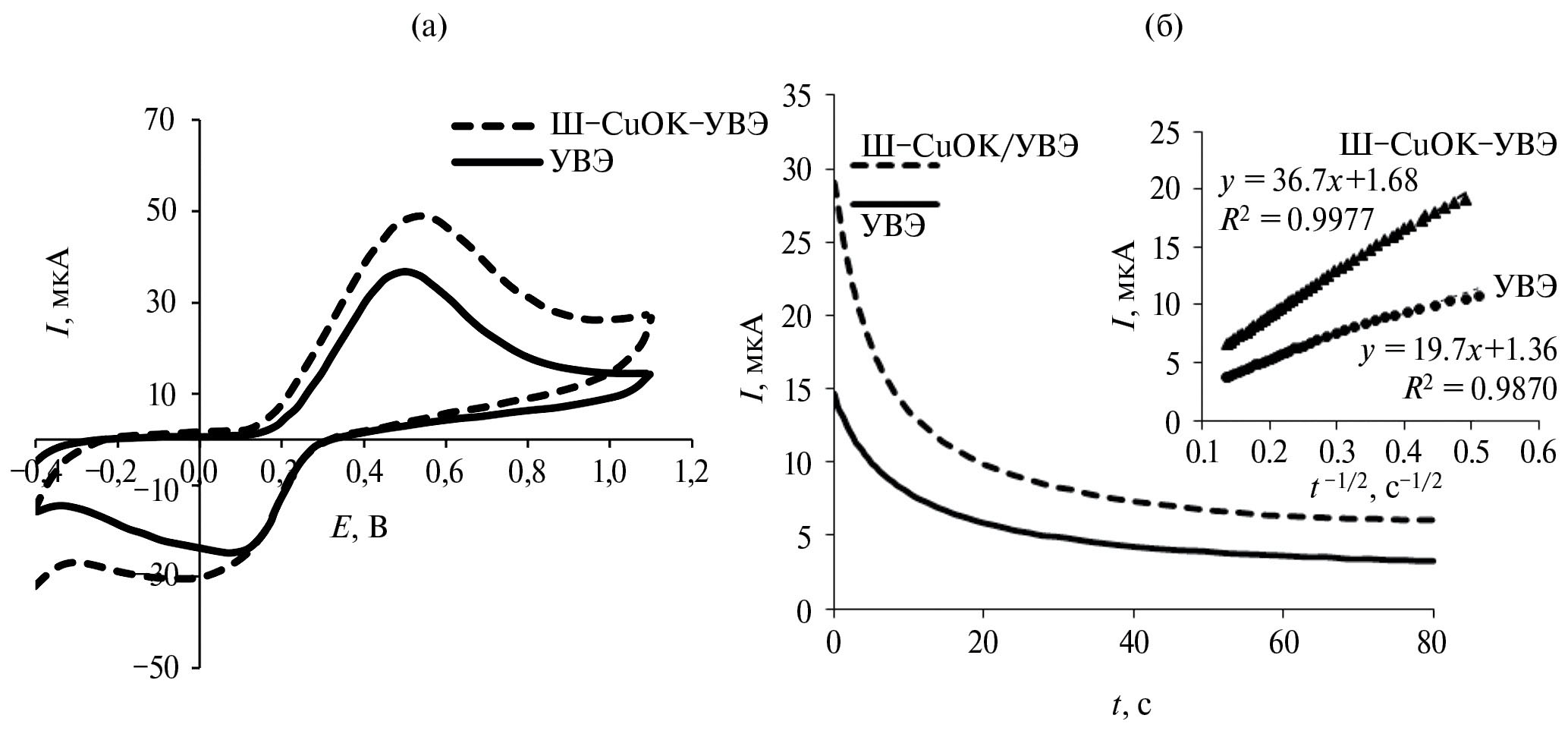 Величины электроактивной площади УВЭ и Ш-CuОК/УВЭ рассчитывали с помощью хроноамперограмм, зарегистрированных при Е = 0.6 В (рис. 5б), и уравнения Коттрелла. Для УВЭ рассчитанная площадь составила 13.1 мм2, для Ш-CuОК/УВЭ – 24.4 мм2. Модифицирование УВЭ привело к возрастанию электроактивной площади в 1.9 раза за счет большой удельной поверхности шунгита.