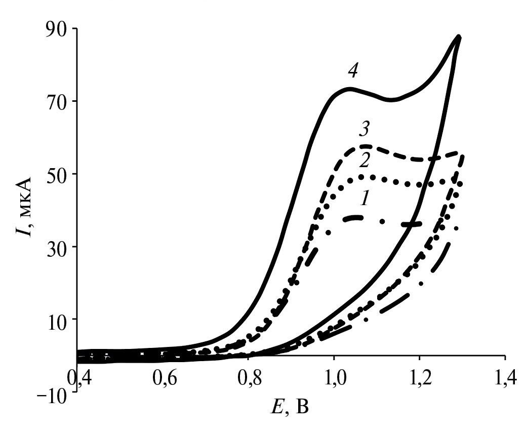 Рис. 6. Циклические вольтамперограммы 0.64 мМ раствора лидокаина на разных электродах: 1 ‒ УВЭ, 2 ‒ CuOК/УВЭ, 3 ‒ Ш/УВЭ, 4 ‒ Ш-CuOК/УВЭ. Фон: универсальный буферный раствор с рН 8, ν = 50 мВ/с.