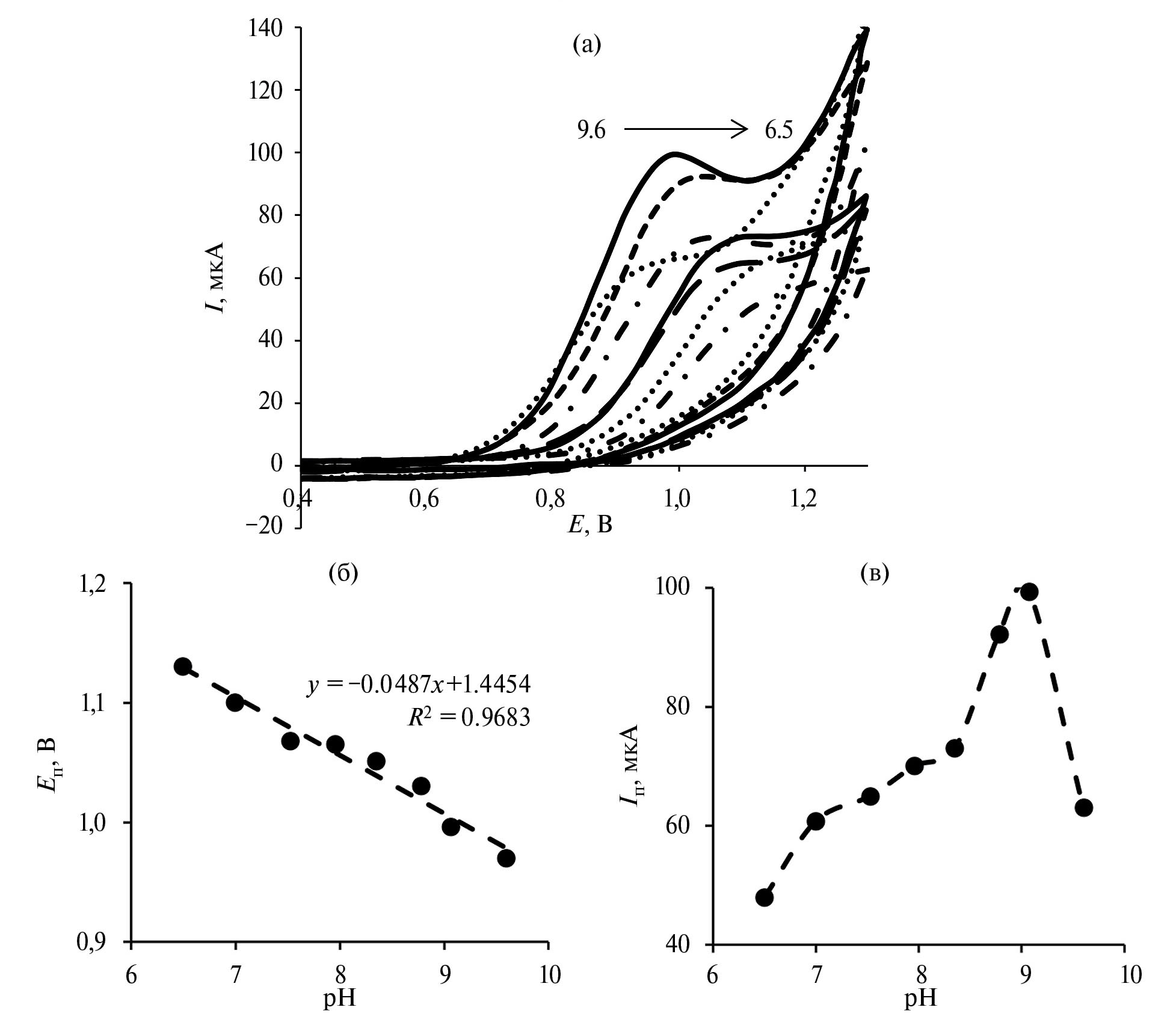 Влияние рН. Методом циклической вольтамперометрии изучено влияние pH УБС в диапазоне от 6.5 до 9.6 на вольт-амперные характеристики лидокаина. Потенциал пика (Еп) окисления лидокаина сдвигается к менее анодным потенциалам с увеличением рН (рис. 7а), что свидетельствует об участии протонов в электродной реакции. Наклон зависимости Еп от рН (рис. 7б) составил 49 мВ/рН, что указывает на равное число протонов и электронов, участвующих в электродной реакции окисления лидокаина [22]. Отсутствие катодных пиков подтверждает необратимость окисления лидокаина во всем диапазоне рН. Ток окисления лидокаина растет с увеличением рН УБС от 6.5 до 8.0. При значении рН УБС выше 8.0 ток окисления лидокаина увеличивается более резко и достигает максимума при рН 9.0. При рН 8–9 в растворе преобладает депротонированная по амидной группе форма лидокаина, которая дополнительно способствует взаимодействию лидокаина с CuOК по типу N–Cu с участием атома азота амидной группы в анионной форме и накоплению его на поверхности электрода [10]. При рН > 9 усиливаются процессы гидролиза амидной группы лидокаина с образованием слаборастворимых в воде продуктов [23], что вызывает падение тока (рис. 7в). Для дальнейших исследований выбрали фоновый раствор с рН 9.0, обеспечивающий наибольший ток окисления лидокаина.