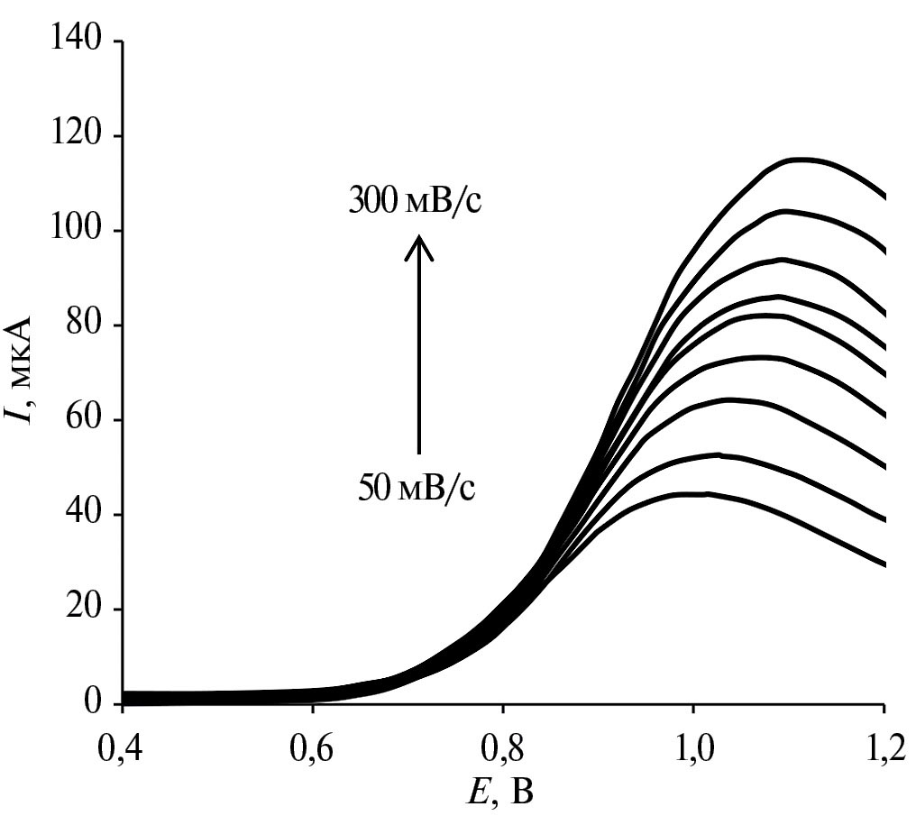 Влияние скорости сканирования потенциала. Для исследования особенностей процесса электроокисления лидокаина зарегистрировали вольтамперограммы с линейным сканированием потенциала в диапазоне от 0.2 до 1.3 В при различных скоростях сканирования от 50 до 300 мВ/с (рис. 8) и получили зависимости тока и потенциала от скорости сканирования потенциала.