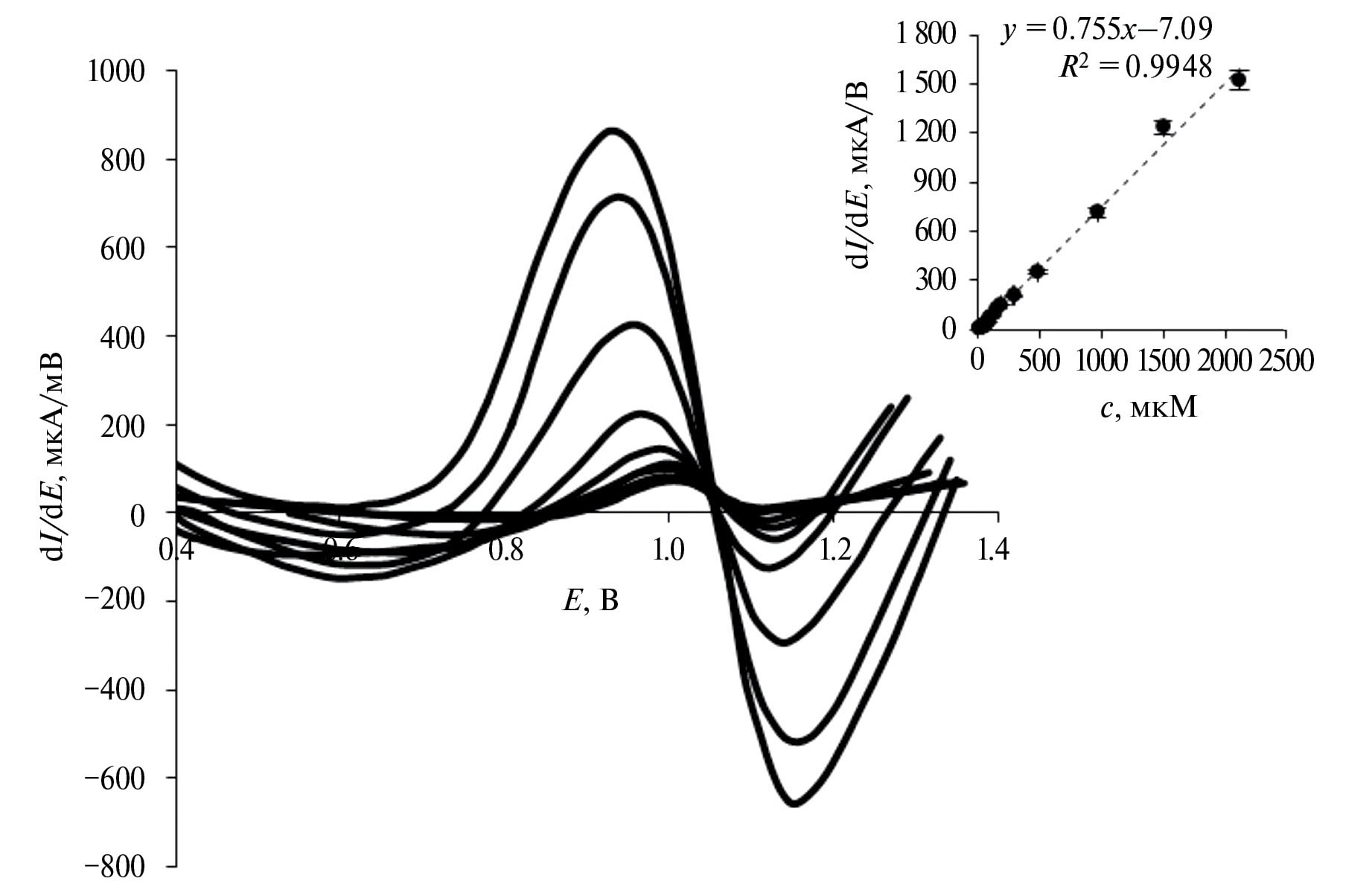 Аналитические и эксплуатационные характеристики сенсора. Для оценки аналитических характеристик разработанного сенсора регистрировали линейные вольтамперограммы лидокаина в режиме производных (dI/dE), обеспечивающем бóльшую чувствительность и разрешающую способность метода. На рис. 9 представлены производные вольтамперограммы при разной концентрации лидокаина в растворе. Ток, регистрируемый при Е = 1.05 В, линейно зависит от концентрации лидокаина в растворе (вставка на рис. 9), что позволяет считать его аналитическим сигналом. Прямо пропорциональная зависимость между аналитическим сигналом и концентрацией лидокаина в диапазоне от 2 до 2120 мкМ описывается уравнением: