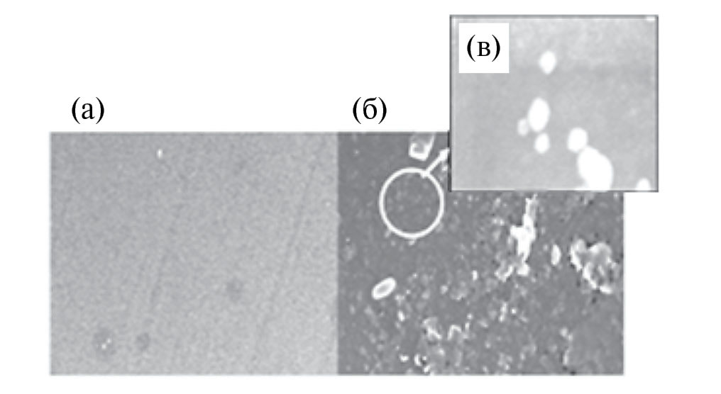 Рис. 1. АСМ-изображения поверхности СУЭ: (а) – поверхность СУЭ (5000×); (б) – поверхность Ar/СУЭ (8000×); (в) – колонии модификатора на СУЭ (120 000×).