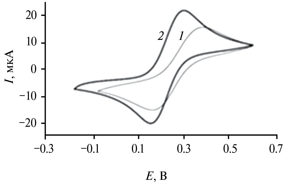 Рис. 3. Циклическая вольтамперограмма пары феррицианид/ферроцианид на (1) СУЭ и (2) Ar/ЗСУЭ в 0.1 М Н3РО4 (рН 2), содержащей 1.0 мМ K3[Fe(CN)6]/1.0 мМ K4[Fe(CN)6].