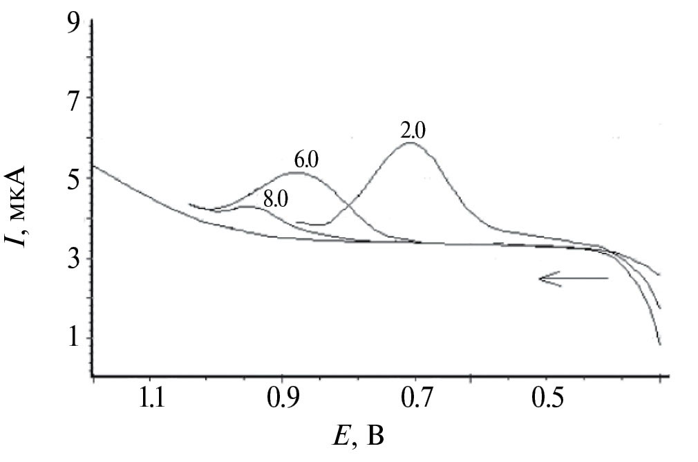 Влияние pH. Кислотность среды оказывает различное влияние на электрохимические сигналы амикацина. По мере увеличения рН фонового электролита наблюдается уменьшение тока электроокисления и смещение потенциала пика в более электроположительную область, что указывает на участие протонов в электрохимической реакции (рис. 6).