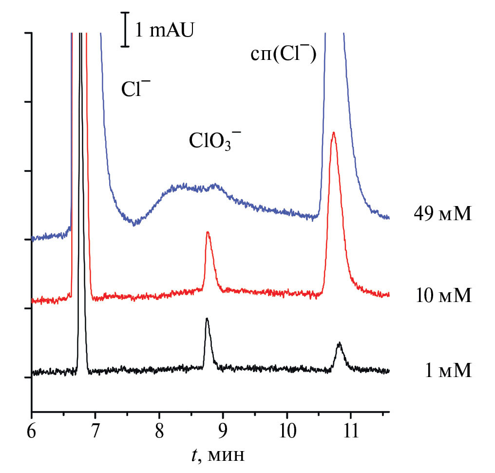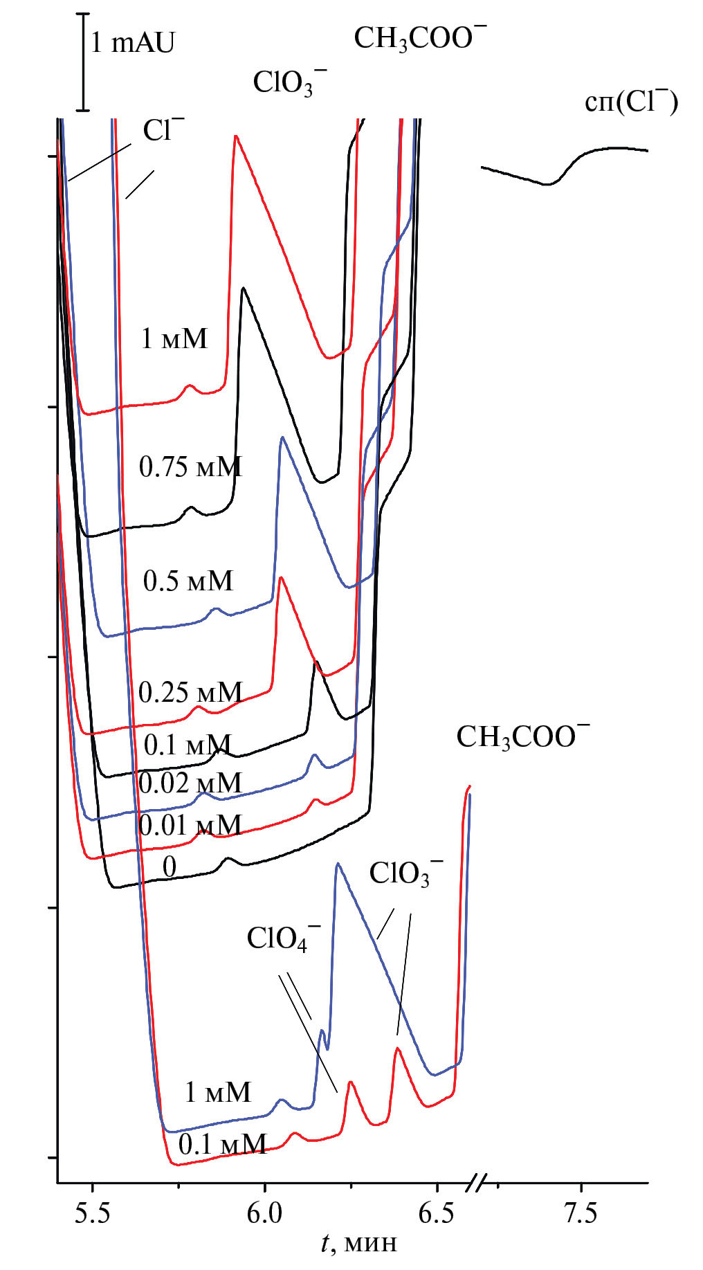 Изучили мешающее влияние перхлорат-ионов на определение хлорат-ионов в оптимальных условиях разделения, поскольку эти ионы имеют близкие электрофоретические подвижности [11]. Как видно из рис. 5, пик перхлорат-ионов в концентрации 0.1 мМ делится до базовой линии с пиком хлорат-ионов с такой же концентрацией. Однако при повышении концентрации хлорат-ионов до 1 мМ рассматриваемые пики перестают делиться до базовой линии (рис. 5). Тем не менее максимум пика перхлорат-ионов в этом случае заметен и для устранения их мешаюшего влияния необходимо просто разбавить пробу.