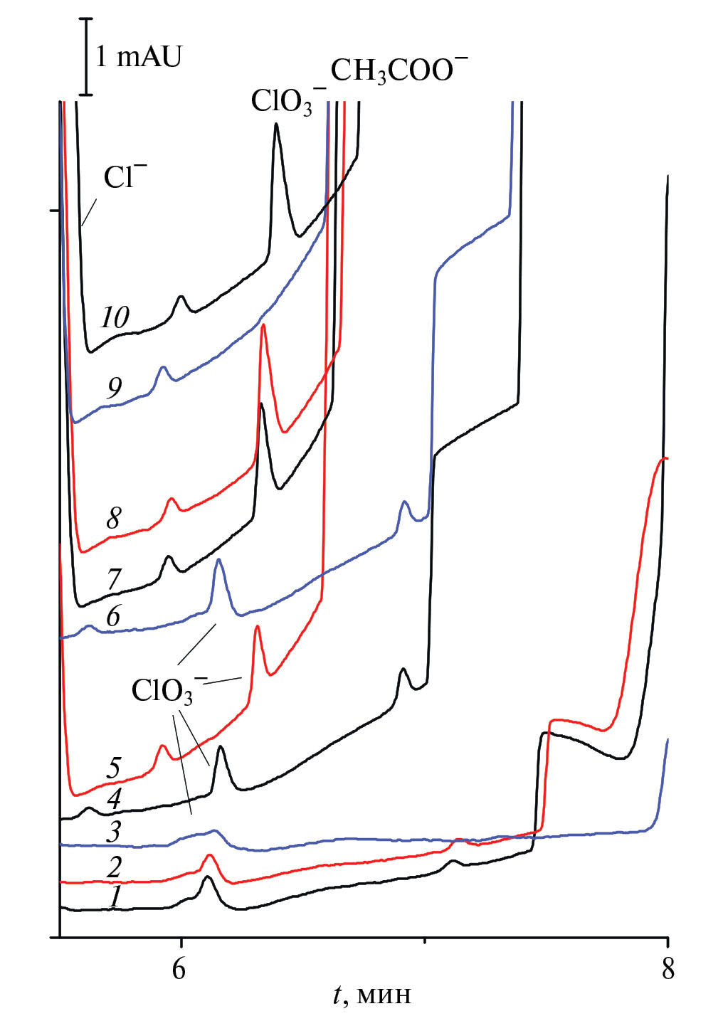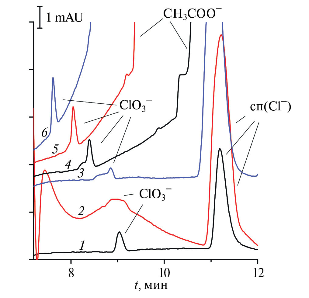 Исследовали влияние типа катиона (литий, калий, натрий) в самой пробе, а также концентрации хлорид-ионов на форму, площадь и время миграции пика хлорат-ионов. Первый фактор исследовали на примере проб с содержанием 0.1 мМ хлората калия и 35 мМ хлоридов щелочных металлов, при этом влияния не обнаружили. Для исследования влияния второго фактора зарегистрировали электрофореграммы проб с концентрацией 10–40 мМ хлорид-ионов при фиксированном содержании хлорат-ионов (0.1 мМ). Установили, что при концентрациях хлорид-ионов 10 и 20 мМ пик хлорат-ионов не отделяется до базовой линии от зоны ацетат-ионов. Площадь пика хлорат-ионов при содержании хлорид-ионов в пробе 25–35 мМ в пределах погрешности одинакова, а для содержания 40 мМ она занижена и слева от пика наблюдается ступенька, аналогично пику хлорат-ионов на рис. 2 (электрофореграмма 5). С понижением концентрации хлорид-ионов время миграции пика хлорат-ионов уменьшается. Рекомендуется разбавлять пробы таким образом, чтобы концентрация хлорид-ионов в пробе была близка к 35 мМ.