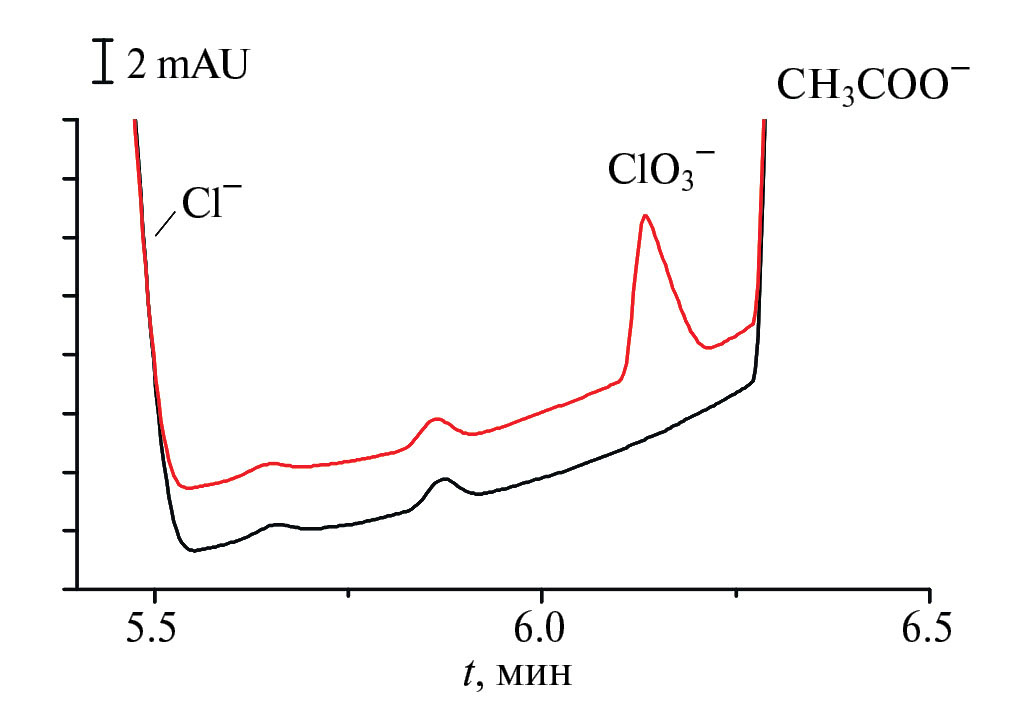 Для снижения предела обнаружения хлорат-ионов в случае их низкого содержания при прочих фиксированных условиях следует увеличить время ввода пробы. Однако при этом требуется увеличить и ширину зоны ацетат-ионов, иначе можно получить такие искаженные пики, как на рис. 2. Установили, что пик хлорат-ионов не виден на электрофореграмме при увеличении времени ввода пробы и зоны ацетат-ионов в два раза, поскольку, вероятно, он не успевает отделиться от зоны ацетат-ионов, которые не обладают хромофорными свойствами, в отличие от хромат-ионов. С целью дальнейшей оптимизации использовали более длинный капилляр с общей/эффективной длиной 80.5/72 см. Для уменьшения времени миграции аналитов и устранения мешающего влияния системного пика от хлорид-иона (сп(Cl-)) [16, 17] увеличили прикладываемое напряжение до -30 кВ и гидродинамическое давление до 100 мбар; системный пик от хлорид-ионов при этих условиях также выходит после пика хлорат-ионов и не мешает его определению. Таким образом удалось зарегистрировать пик хлорат-ионов при увеличенном в два раза времени ввода пробы. Дальнейшее увеличение длины капилляра нецелесообразно, поскольку используемое оборудование не позволяет применять напряжение >30 кВ и гидродинамическое давление >100 мбар, а при имеющихся условиях для капилляра с общей/эффективной длиной 112.5/104 см время миграции хлорат-ионов по расчетам составит уже около 17 мин.