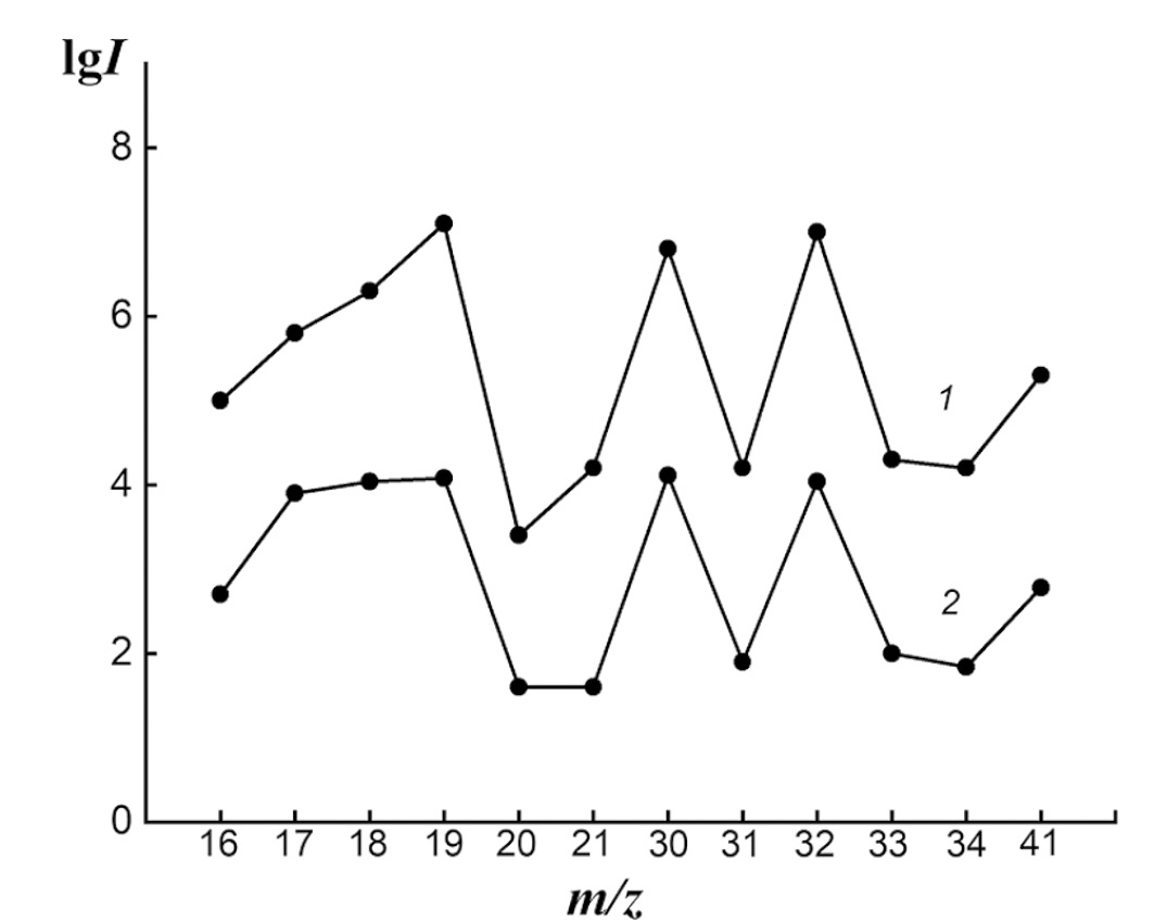 Оцифровка нами фонового спектра из работы [24] и его сопоставление с фоновыми спектрами, полученными в работах [11, 22], показали, что интенсивности основных фоновых ионов в зависимости от соотношения массы к заряду иона m/z (сравнивали совпадающий диапазон данных от 16 до 41 а. е. м.), приведенные в этих работах, меняются практически синхронно (рис. 1). При этом коэффициент корреляции R между этими данными составляет 0.96. Такое высокое значение коэффициента R позволяет при сравнении расчетных и экспериментальных данных ориентироваться на любую из публикаций [11, 22, 24].