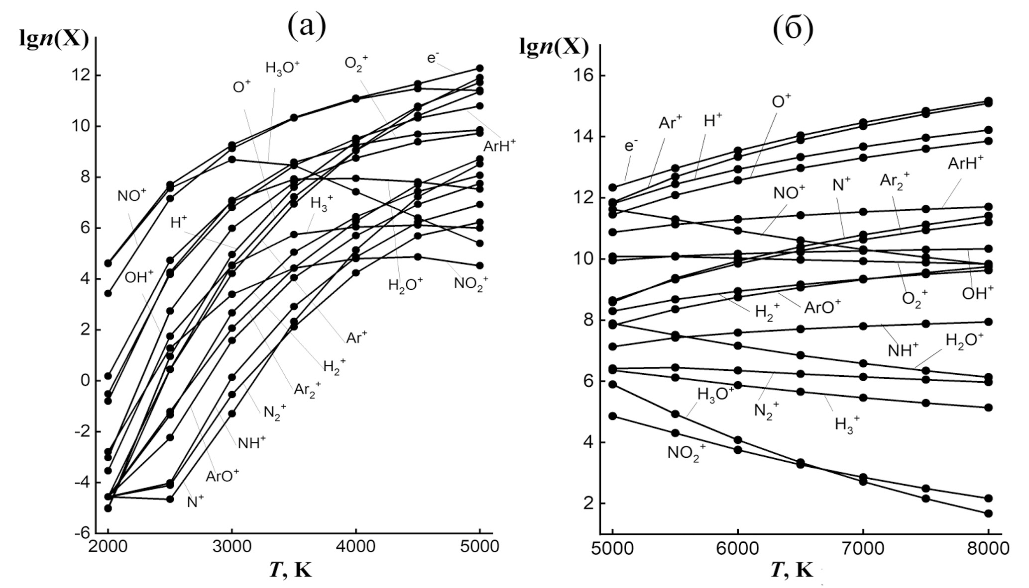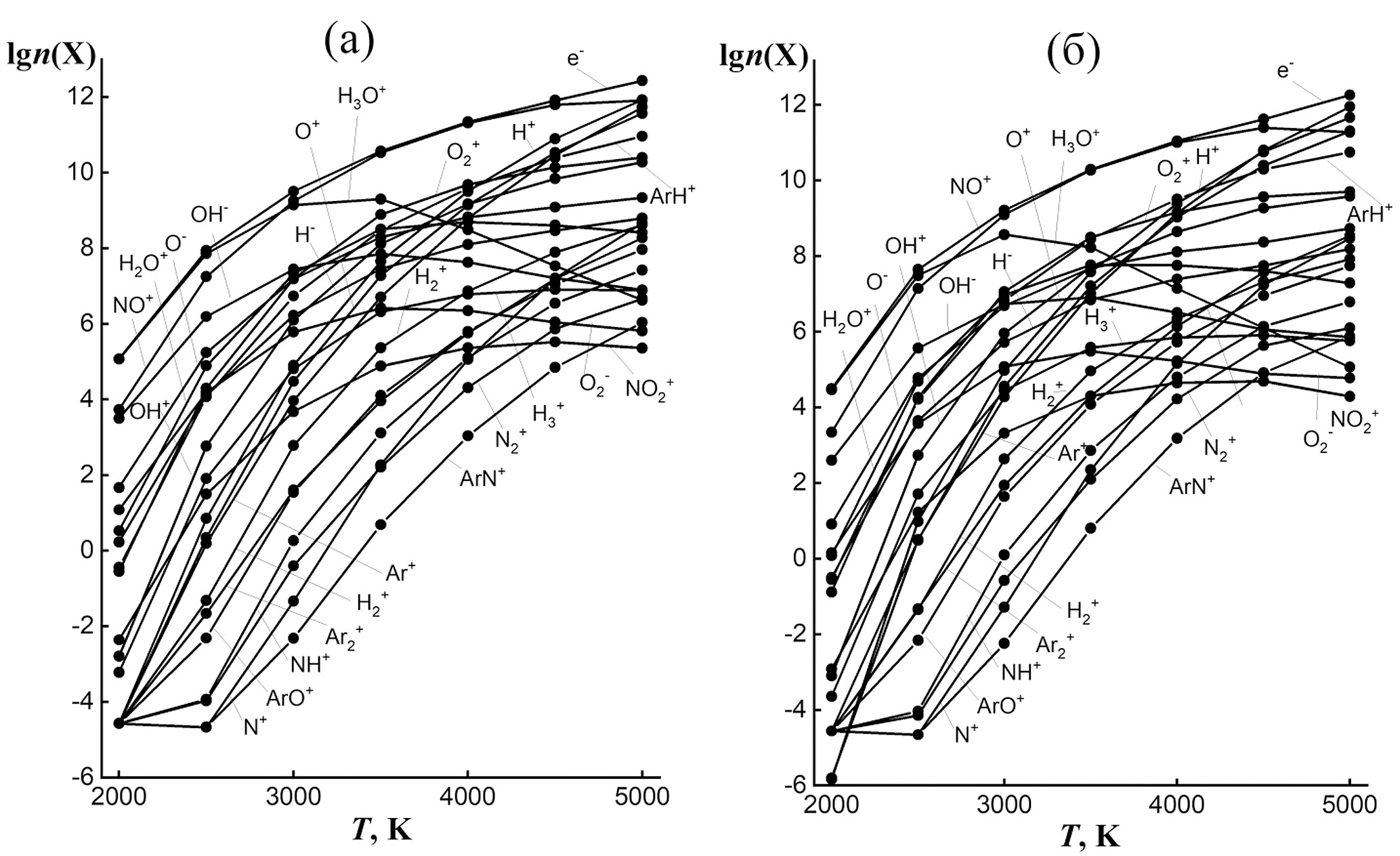 Рис. 6. Изменение расчетных логарифмов концентраций lgn(Х) (см–3) различных фоновых ионов Х в зависимости от температуры T (K) для условий “холодной” плазмы при различных массовых соотношениях Ar : H2O: (а) – 40 (0.8 л/мин аргона) и (б) – 120 (2.4 л/мин аргона).