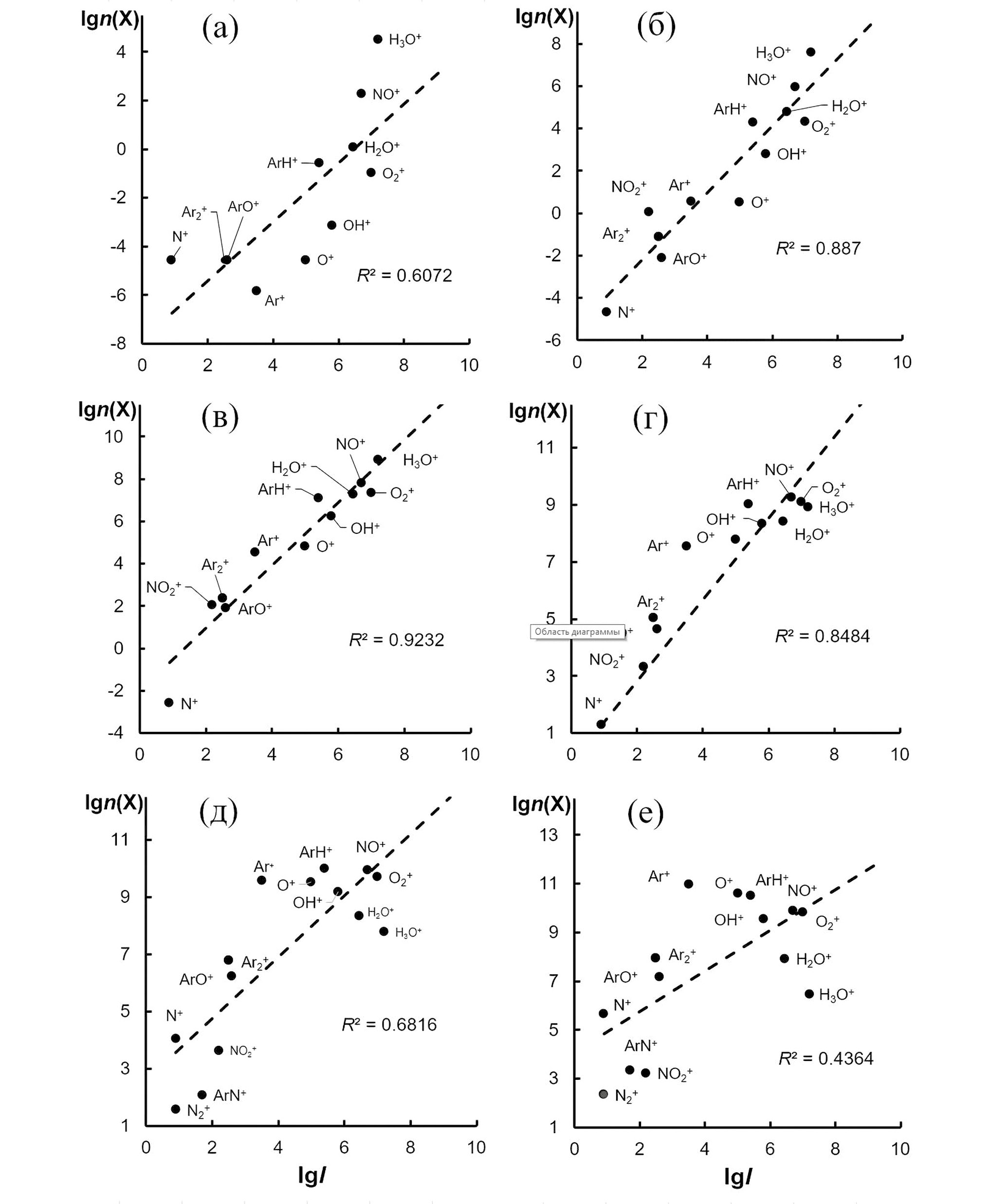Рис. 3. Сопоставление рассчитанных логарифмов концентраций lgn(Х) (см–3) фоновых ионов Х с логарифмами экспериментальных интенсивностей [11, 22] lgI (импульс/с) этих ионов, а также коэффициенты детерминации R2 между расчетными и экспериментальными данными при различной расчетной температуре Т “холодной” плазмы, К: (а) – 2000, (б) – 2500, (в) – 3000, (г) – 3500, (д) – 4000, (е) – 4500.