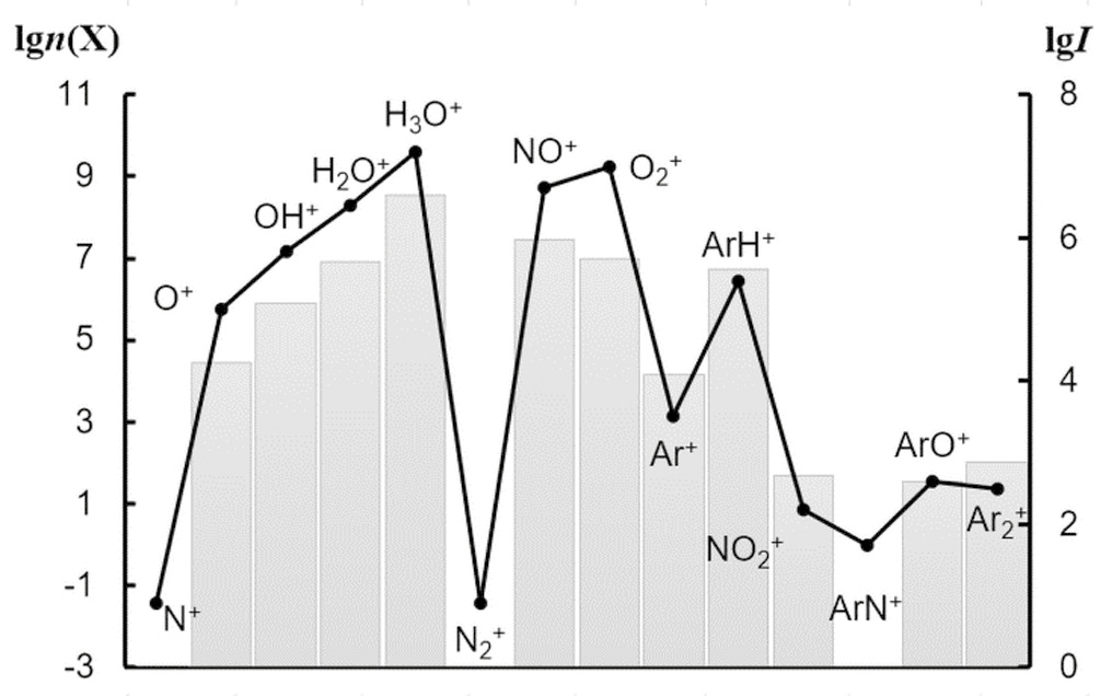Рис. 4. Гистограмма сопоставления рассчитанных (столбики) логарифмов концентраций lgn(Х) (см–3) фоновых ионов Х с логарифмами экспериментальных интенсивностей (точки) lgI (импульс/с) этих ионов [11, 22] при расчетной температуре “холодной” плазмы 3000 К.