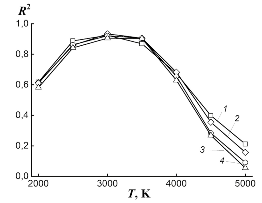 Рис. 5. Изменение коэффициента детерминации R2 между рассчитанными логарифмами концентраций фоновых ионов (см–3) и логарифмами экспериментальных интенсивностей (импульс/с) этих ионов [11, 22] в зависимости от температуры “холодной” плазмы T при различных массовых соотношениях H2O : HNO3: 1 – 10 000, 2 – 1000, 3 – 100, 4 – 25.