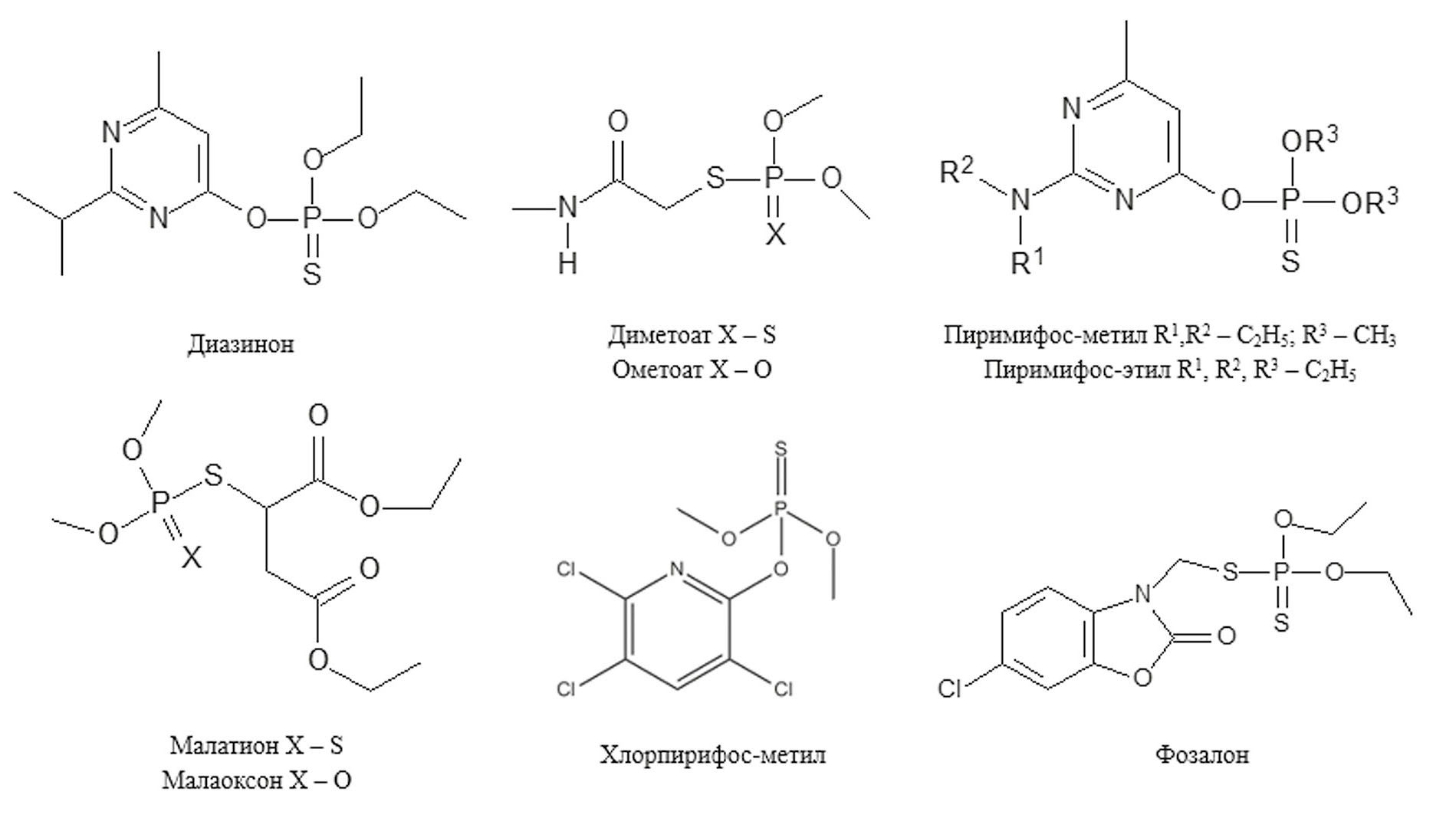 Перечень пестицидов и агрохимикатов, разрешенных к применению на территории Российской Федерации, представлен в государственном каталоге [27], где ограничено применение персистентных хлорорганических пестицидов. Перечень включает девять ФОП: диазинон, диметоат, ометоат, пиримифос-метил, пиримифос-этил, малатион, малаоксон, хлорпирифос-метил, фозалон, которые мы выбрали в качестве образцов для настоящего исследования (схема 1).