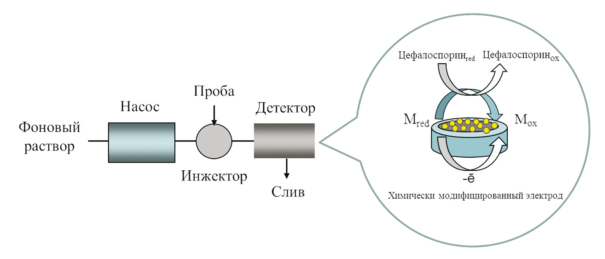 В рамках фармацевтического анализа, как известно, для определения различных органических соединений широко используются электрохимические сенсоры, обладающие стабильным и чувствительным откликом [12, 13]. При их создании рабочую поверхность электрода (обычно из углеродного материала) модифицируют с целью улучшения аналитических и метрологических характеристик отклика. Модификация поверхности электрода способствует уменьшению перенапряжения окисления органических соединений, наблюдаемого на углеродных электродах, а также снижению нижней границы определяемых содержаний [14]. В итоге применение химически модифицированных электродов (ХМЭ) приводит к повышению чувствительности и селективности вольтамперометрического отклика на органические соединения, в том числе цефалоспорины [15–17]. Не менее важно и то, что ХМЭ могут “работать” как амперометрические детекторы в проточных системах, что позволяет проводить большое количество измерений с высокими чувствительностью и селективностью в автоматизированном режиме быстро и с низкими затратами [18, 19]. С целью автоматизации анализа объектов окружающей среды и объектов биомедицины чаще всего используют проточно-инжекционные системы [20–23].
