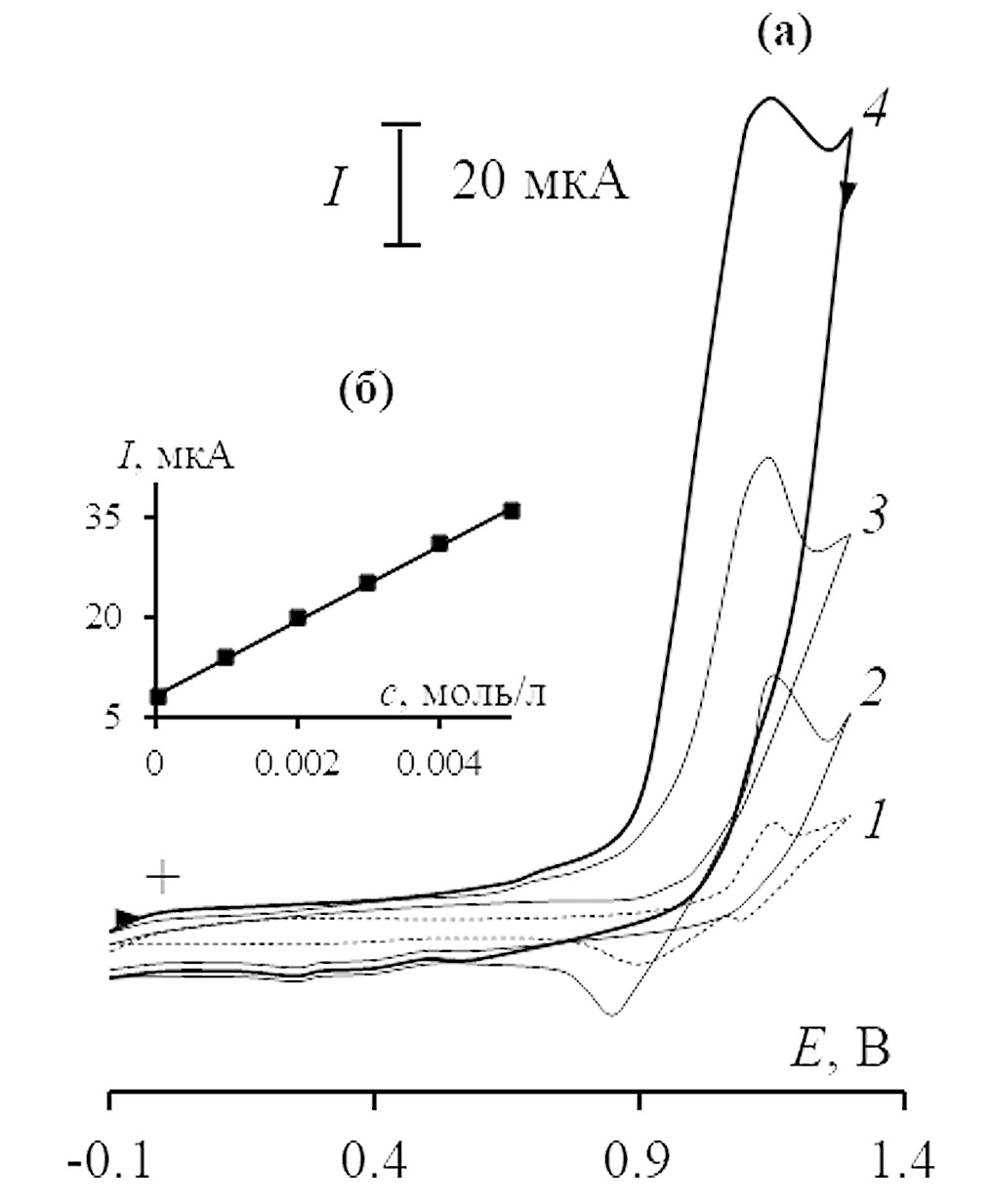 Рис. 2. (а): Циклические вольтамперограммы на электроде RuOx–СУ в отсутствие цефтриаксона (1) и на электродах RuOx–СУ (2), Au–СУ (3) и Au–RuOx–СУ (4) в присутствии 5 × 10–3 М цефтриаксона на фоне 0.05 М H2SO4. (б): Зависимость тока при Е = 1.15 В от концентрации цефтриаксона на электроде RuOx–СУ (n = 6, P = 0.95).