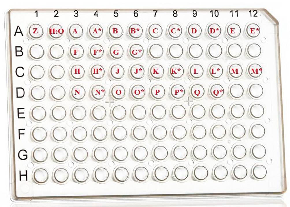 Визуальную флуориметрию на планшетах с оцифровкой результатов взаимодействия флуоресцентных зондов Z1–Z4 и тест-веществ проводили при естественном освещении и на денситометре ДенСкан (ООО “НЦ “Ленхром”, Россия) при двух длинах волн возбуждения (365, 254 нм). Планшеты формировали по единой схеме добавления веществ с двукратным повторением (рис. 1). Для веществ с явным или сомнительным аналитическим откликом лунки дополнительно повторяли.