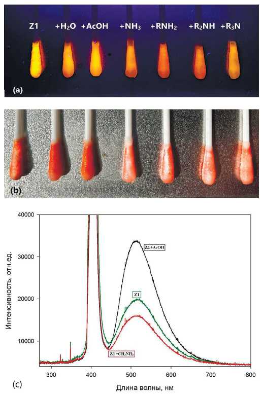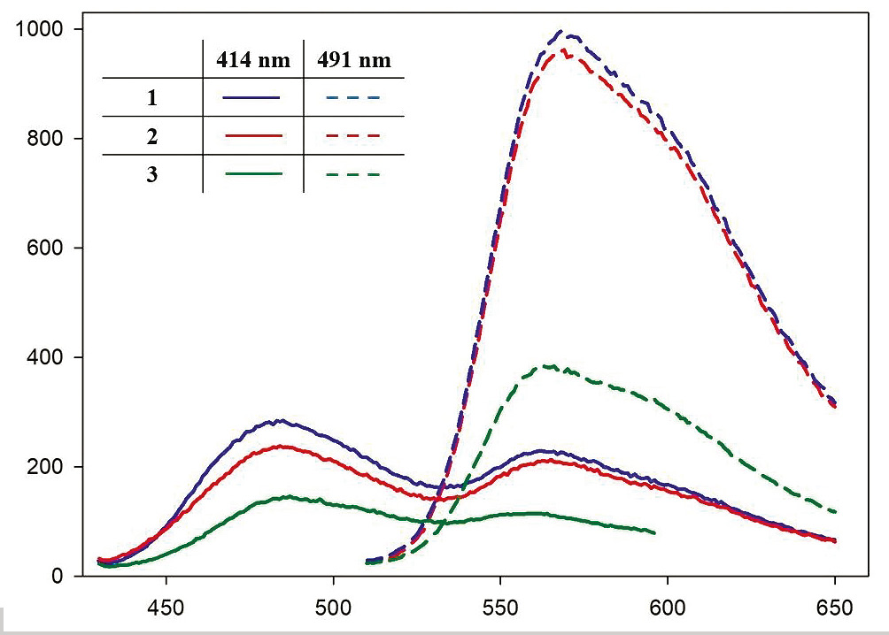 Рис. 2. Фотолюминесценция (на примере реагента Z1) в воде без добавок (1), с добавлением 14 мМ раствора аммиака (2) и 60 мМ HCl (3).