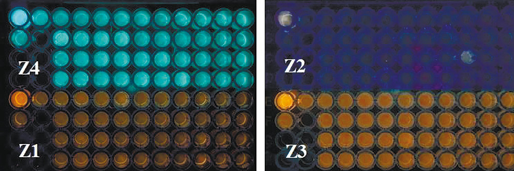 Так как биопробы представляют собой сложную систему с большим содержанием воды, далее визуально оценивали аналитический отклик растворов органических флуорофоров Z1–Z4 в присутствии тест-веществ на планшете. К растворам реагентов добавляли водные растворы тест-веществ минимальной (физиологическая норма) и максимальной (не норма) концентраций. Примеры планшетов представлены на рис. 3. За аналитический сигнал принимали любые видимые при естественном освещении, при 365 и 254 нм изменения в лунках: подавление, усиление флуоресценции или изменение окраски.