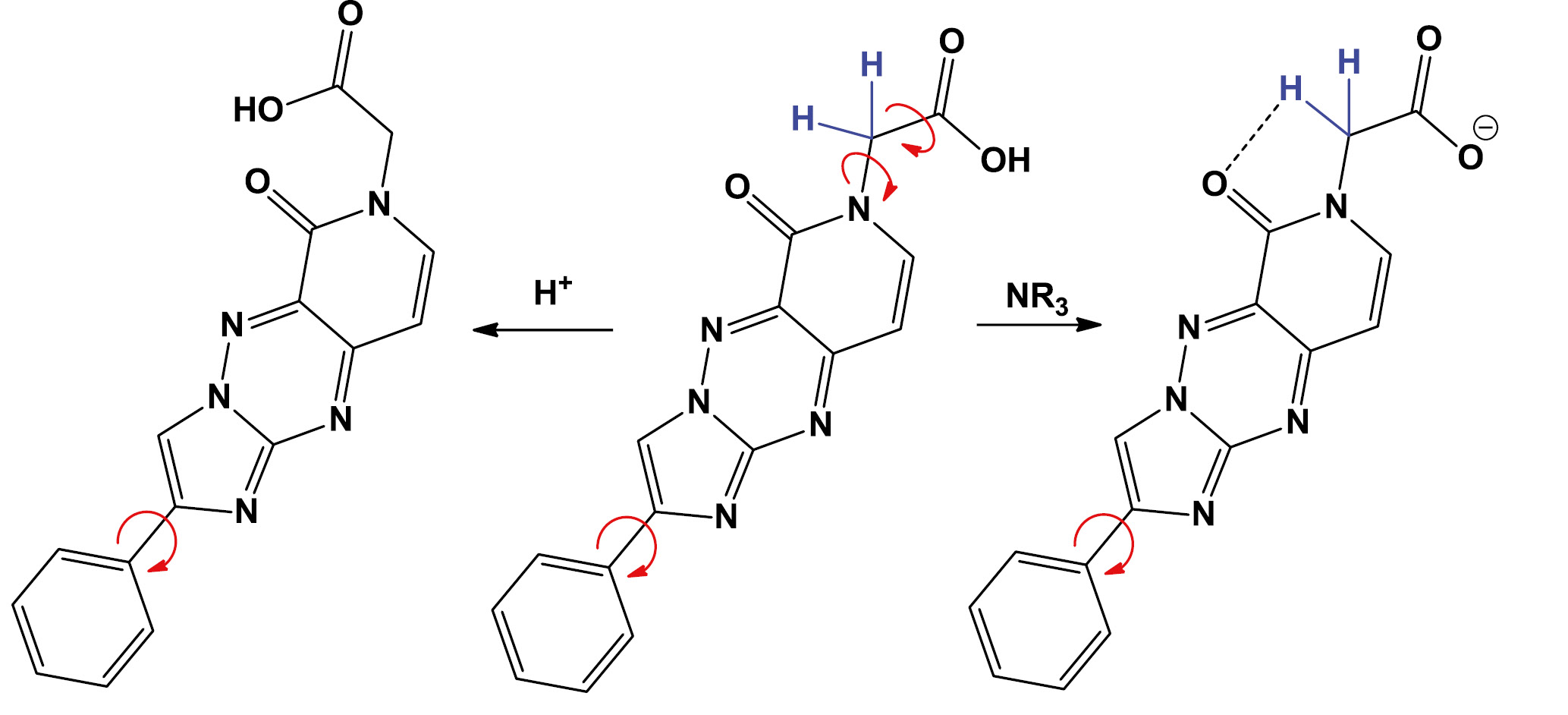 В качестве флуорофоров при разработке полевых тест-систем актуально применение органических агентов, в частности азолотриазинов, которые имеют ярко выраженную и стабильную люминесценцию [14–16]. Что касается люминесцентных свойств, среди возможных комбинаций триазинового и азольных циклов в молекуле биофлуорофора представляют интерес имидазо[1, 2-b][1, 2, 4]триазины. Люминесценция имидазотриазинов в зависимости от природы среды и ее биоактивности хорошо изучена, поэтому их применяют в качестве флуоресцентных зондов для различных биомедицинских приложений [17–20]. Недостатком имидазотриазиновых красителей, в отличие от линейно связанных аналогов [21, 22], является низкая интенсивность аналитического сигнала [23–25]. Для решения этой проблемы в структуру таких флуорофоров вводят различные электроноакцепторные функциональные группы и/или дополнительное пиридиновое кольцо [26, 27]. Предварительные испытания на модельных биообъектах [28] показали, что такие красители демонстрируют максимальный аналитический отклик по сравнению со своими предшественниками.