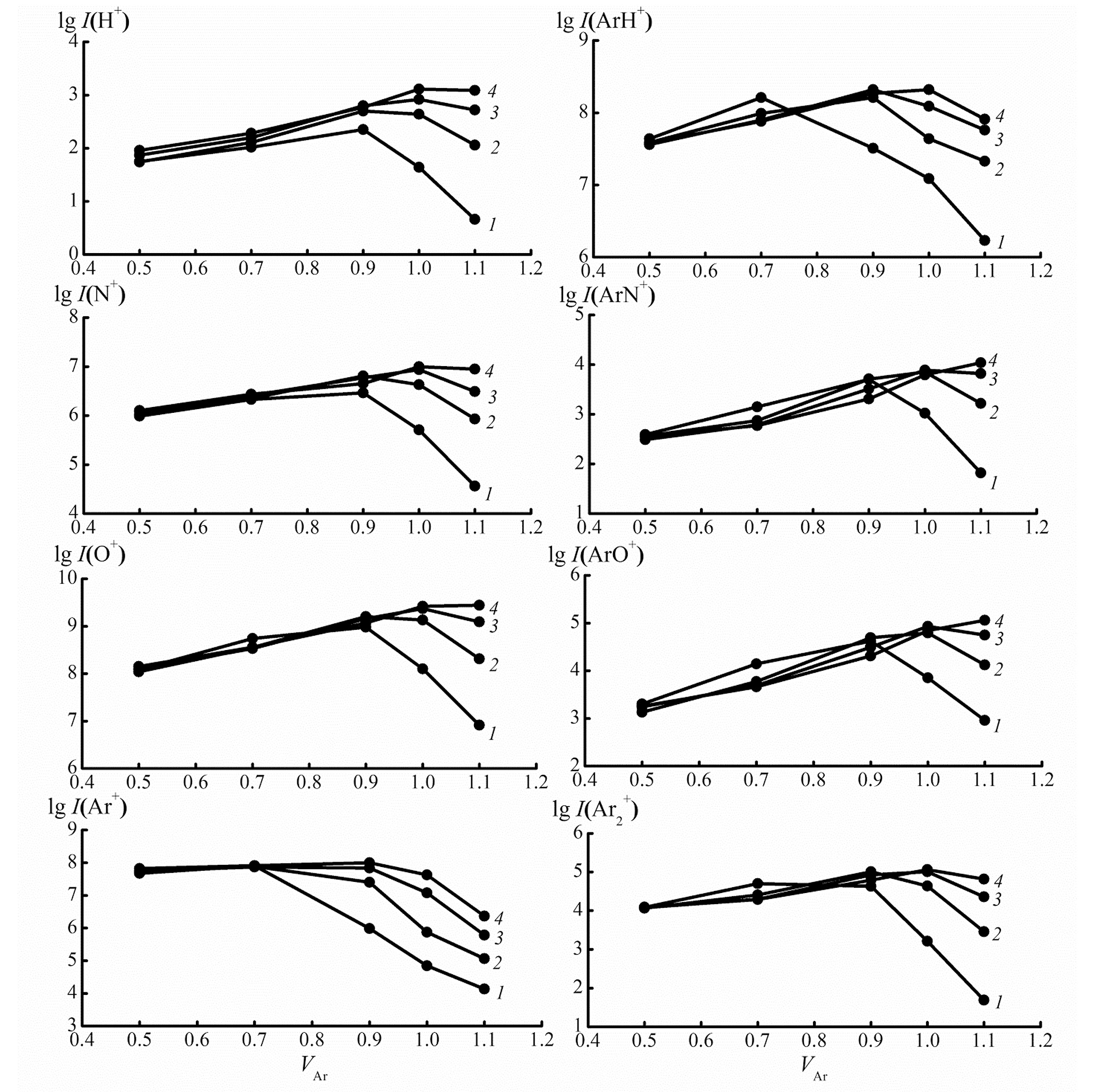 Рис. 2. Экспериментальное изменение логарифмов эффективности образования основных фоновых аргидных ионов ИСП I(ArM+)/I(M+) в зависимости от скорости транспортирующего потока аргона VAr (л/мин) и высокочастотной мощности плазмы, Вт: 1 – 800, 2 – 1000, 3 – 1200, 4 – 1400.