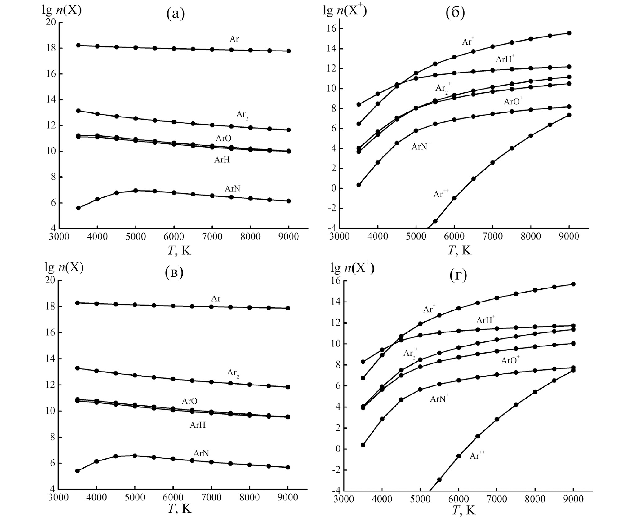 На рис. 3 и 4 приведено расчетное изменение логарифмов концентрации (cм–3) нейтральных частиц n(X) и их фоновых ионов n(X+), включая аргонсодержащие, в ИСП в зависимости от температуры T (К) при расходах транспортирующего потока аргона VAr = 0.22 и 1.0 л/мин. Расчеты показали, что в составе ИСП во всем рассмотренном диапазоне температур основными компонентами являются нейтральные атомарные Ar, H, O и N (рис. 3a, в; 4a, в), поскольку степень их ионизации является достаточно низкой из-за высоких первых потенциалов ионизации данных атомов. Наблюдаемое на графиках небольшое снижение концентрации данных атомов с ростом температуры обусловлено преимущественно температурным расширением газов ИСП. Концентрации всех полиатомных нейтральных частиц, в том числе и аргонсодержащих (кроме ArN), снижаются с ростом температуры, что соответствует их температурной диссоциации. Только для частиц ArN в диапазоне температур 3500–5000 К прослеживается рост концентрации на порядок величины, достижение максимума, а затем ее снижение. Изменение скорости транспортирующего потока аргона в пять раз (от 0.22 до 1.0 л/мин) практически не изменяет все описанные зависимости.