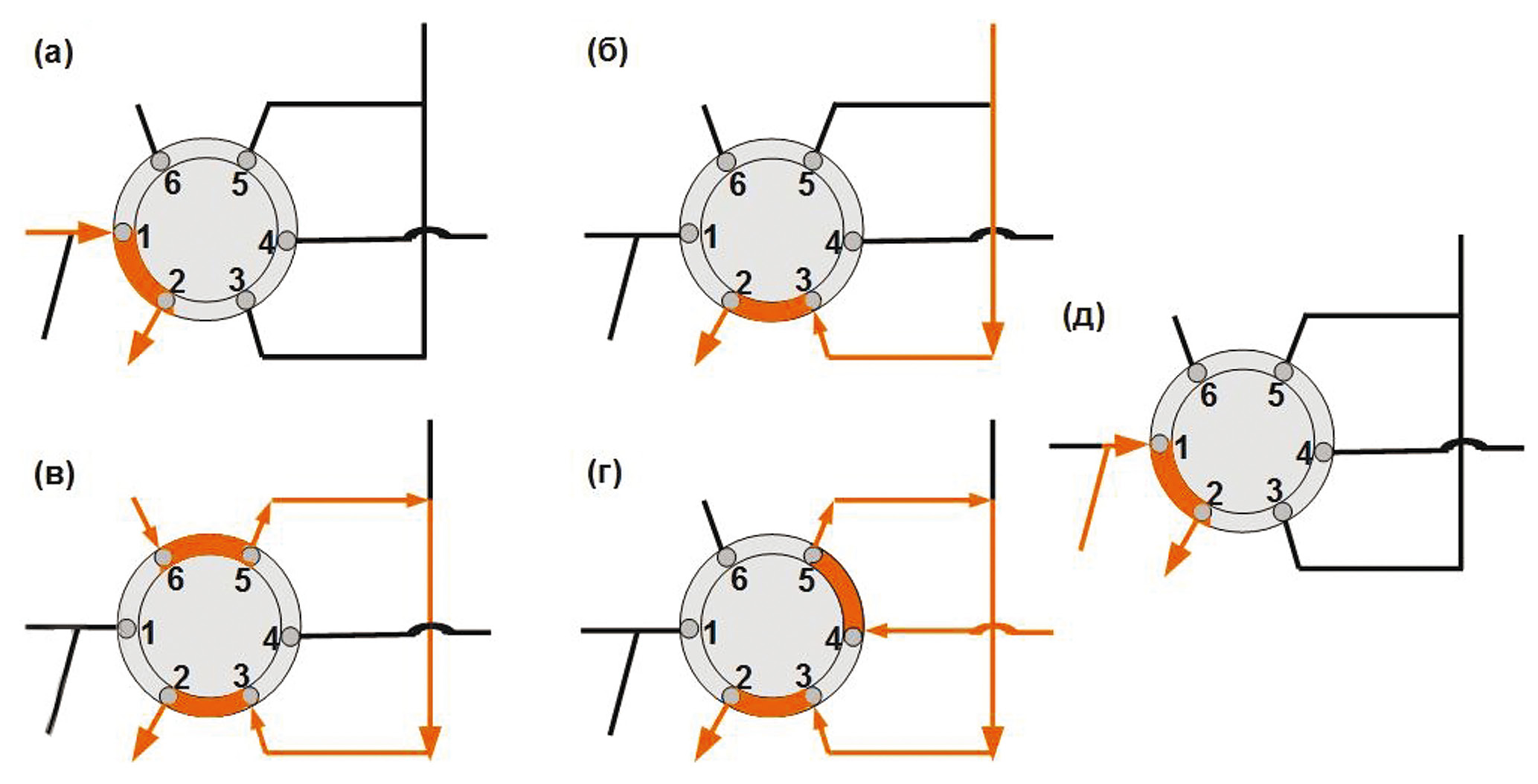 Рис. 3. Положение шестиходового крана и направление потоков при работе автоматизированной системы для матричного твердофазного диспергирования (см. схему на рис. 2, оранжевый цвет – действующий поток, черный цвет – недействующий поток): (а) – пропускание суспензии через колонку К2; (б) – десорбция бисфенола А; (в) – промывка сорбента в колонке К2; (г) – продувка системы воздухом, транспортировка сорбента в колонку К1; (д) – промывка системы бидистиллированной водой.