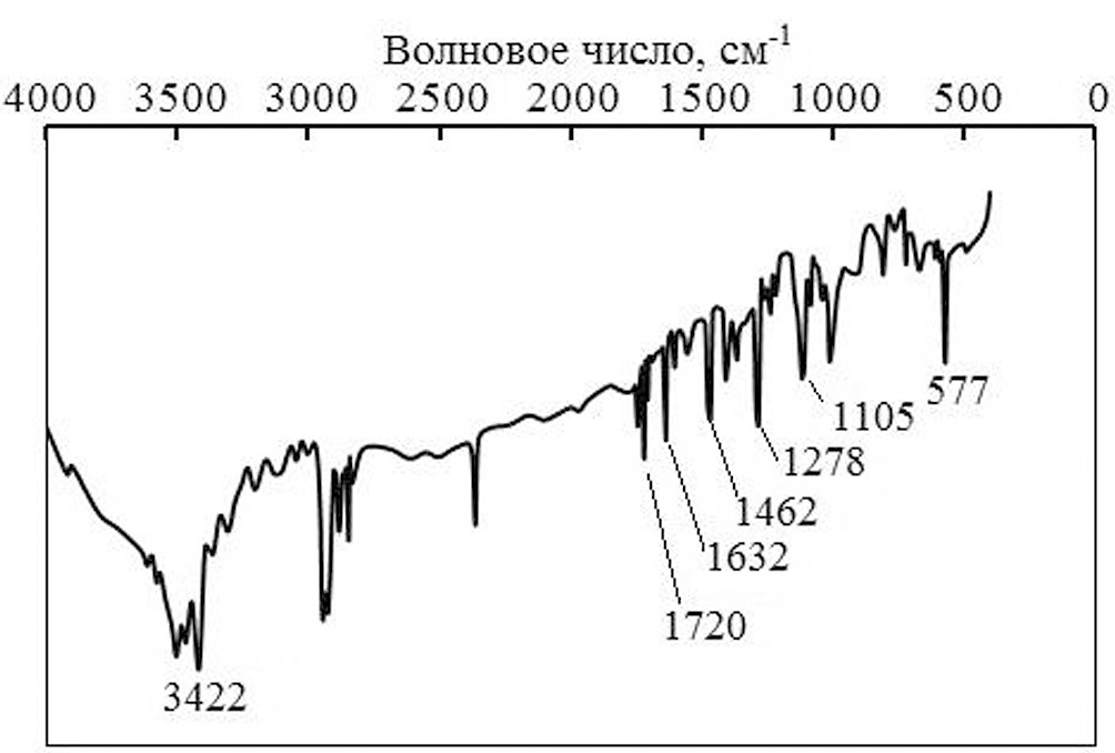 Частицы сорбента представляют собой сложный композит. Размер ядра, покрытого оболочкой (Fe3O4@SiO2-NH2), составляет в среднем 250 нм (рис. 4). На микрофотографии сорбента BuImCO2-ОГ-СО-NH-Fe3O4 видно, что ядра связаны с ОГ, который представлен в виде темных тяжей (рис. 4). Структура сорбента подтверждена методом ИК-спектроскопии с преобразованием Фурье (рис. 5). В ИК-спектре установлены колебания связей Fe–O (577 см–1), Si–O (1105 см–1), –С–О–С– (1278 см–1), –С=С– (1465 см–1), группы –С(О)–NH, за счет которой происходит присоединение к ОГ, (1632 см–1), связи C=О (1720 см–1) и NH2-группы (3422 см–1) [33, 34].