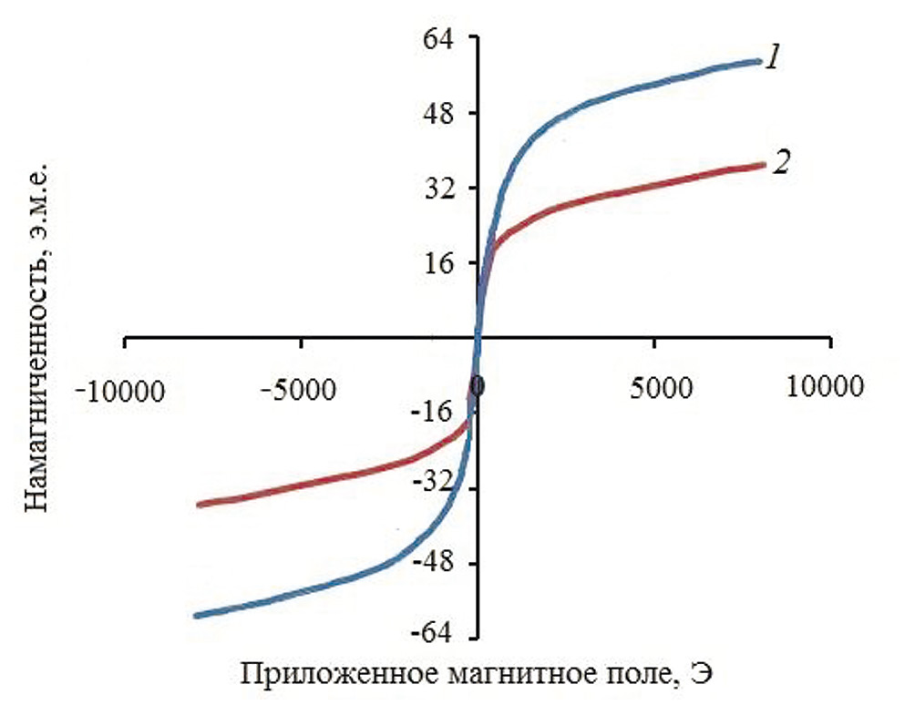 Рис. 7. Кривые намагниченности Fe3O4 (1) и композита BuMeImCO2-ОГ-СО-NH-Fe3O4 (2).