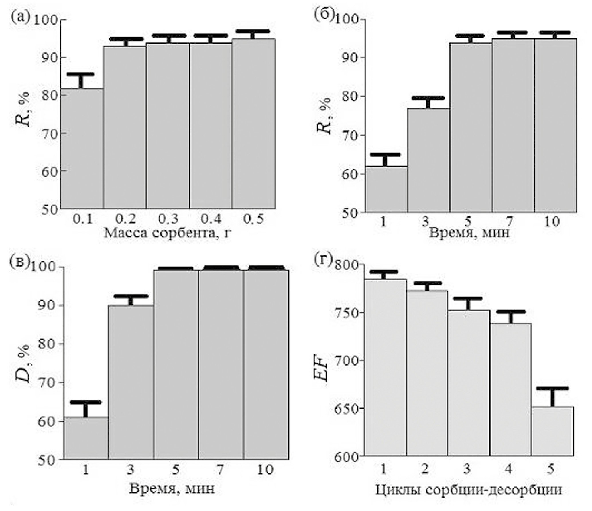 По коэффициентам EF оценена способность к регенерации сорбента. BuMeImCO2-ОГ-СО-NH-Fe3O4 выдерживает четыре цикла сорбции-десорбции без существенной потери сорбционной емкости (рис. 10г). За четыре цикла коэффициенты EF снижаются на 4.5%. На пятом цикле сорбции-десорбции происходит снижение EF на 15%. Основное влияние на снижение сорбционной емкости оказывают металлорганические соединения (особенно соединения ртути – метилртуть, этилртуть, фенилртуть и др.), которые также эффективно сорбируются гуматами в условиях МТФД (идентифицированы на хроматограмме после десорбции). При этом их десорбция в условиях эксперимента, вероятно, протекает в незначительной степени и вызывает постепенное накопление металлорганических соединений в сорбенте.