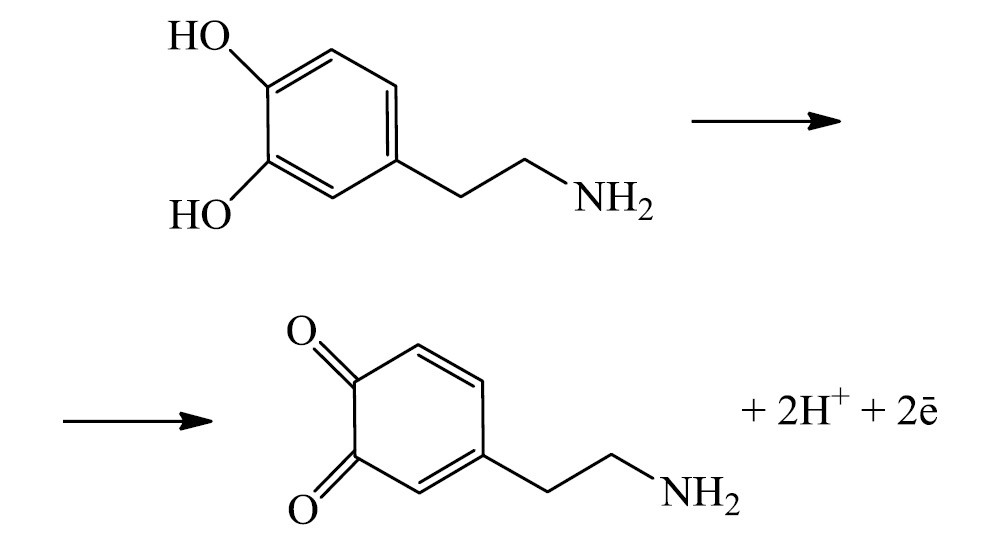 Электродные реакции, протекающие на СУЭ в растворах ДА, включают 2-электронный процесс, который сопровождается переносом двух протонов с образованием о-хиноидного фрагмента в структуре продукта окисления этого биогенного амина. Электрохимический процесс соответствует следующему уравнению (схема 2) [21]: