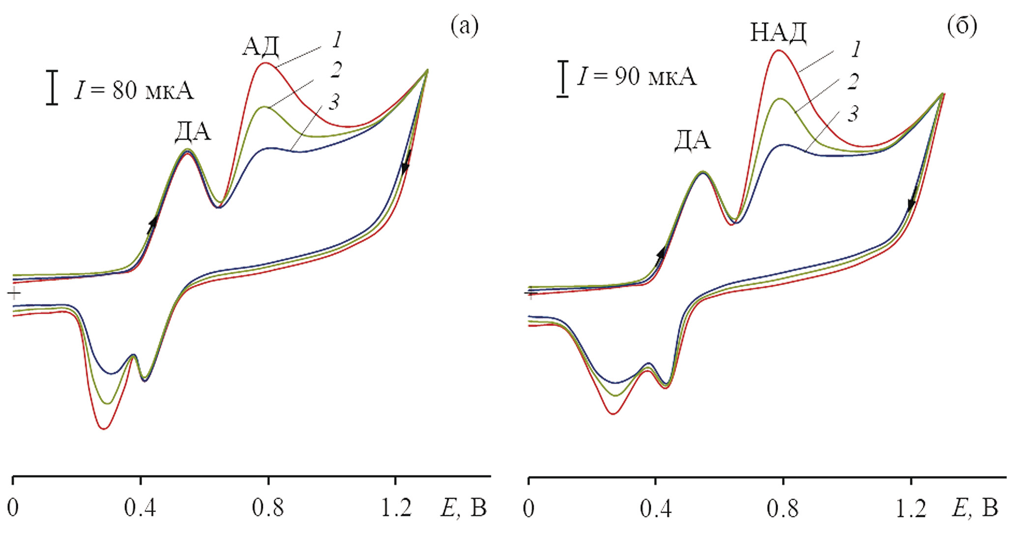 Вольтамперометрия с химически модифицированными электродами (ХМЭ) значительно расширяет аналитические возможности метода при определении органических соединений [8, 9]. Электрохимическое определение ДA в присутствии АД или НАД проводят на ХМЭ на основе пленки из нафиона [10], частиц золота [11], углеродных материалов [12], а также композитов на их основе [13, 14].
