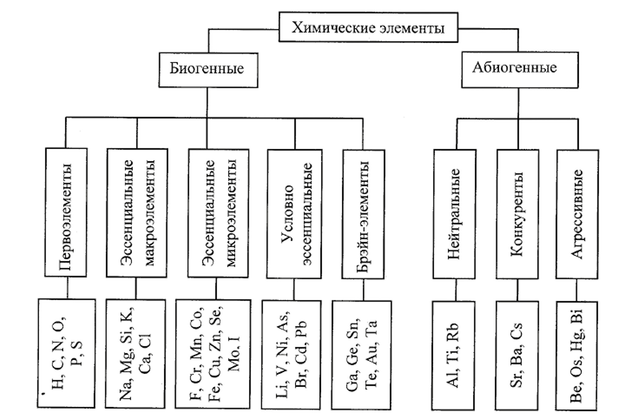 Более полная классификация предложена Бгатовым [36] (рис. 2). Автор обобщил исследовательские данные и применил эволюционный подход. Группа основных элементов живого вещества (первоэлементов) представлена неметаллами, участвовавшими в образовании органических молекул на ранних этапах эволюции. При этом деление на макро- и микроэлементы воспринимается как условное, поскольку все зависит от их содержания в изучаемом виде. Бесспорно, к биогенным макроэлементам автору следовало бы отнести также Mg, K и Ca, так как их концентрация в растениях обычно превышает 0.1% [5]. В сообществе биогенных элементов Бгатов [36] выделил условно эссенциальные и брэйн-элементы, роль которых до конца еще не определена. Последние обнаружены в головном мозге, и они, предположительно, участвуют в передаче нервных импульсов. Нейтральные элементы не участвуют в метаболизме из-за низкой реакционной способности. Автор избегает термина “токсичный элемент”, введя понятие “агрессивный”. Конкурентами называет элементы, замещающие другие, например стронций замещает кальций [5], что приводит иногда к отклонению от нормального физиологического состояния.