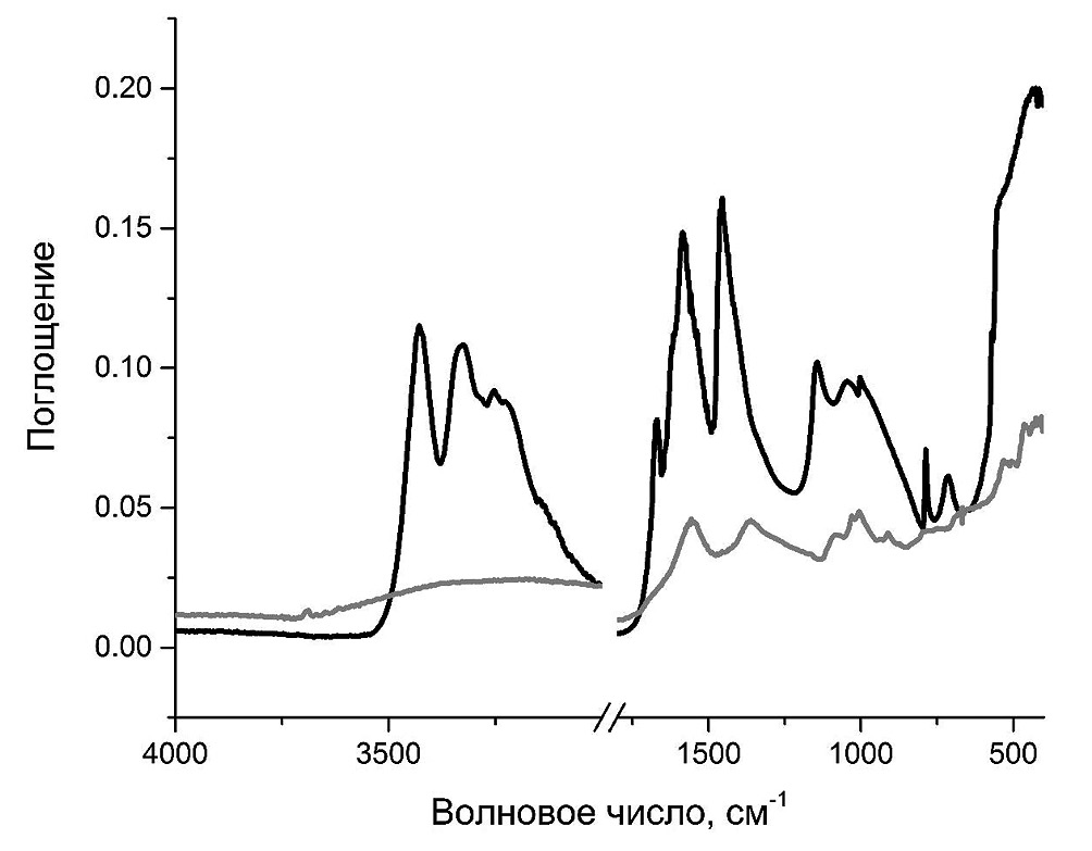 Рис. 1. ИК-НПВО-спектры поглощения порошков гумата Powhumus (серая линия) и мочевины (черная линия) в средней ИК-области (4000–400 см–1).