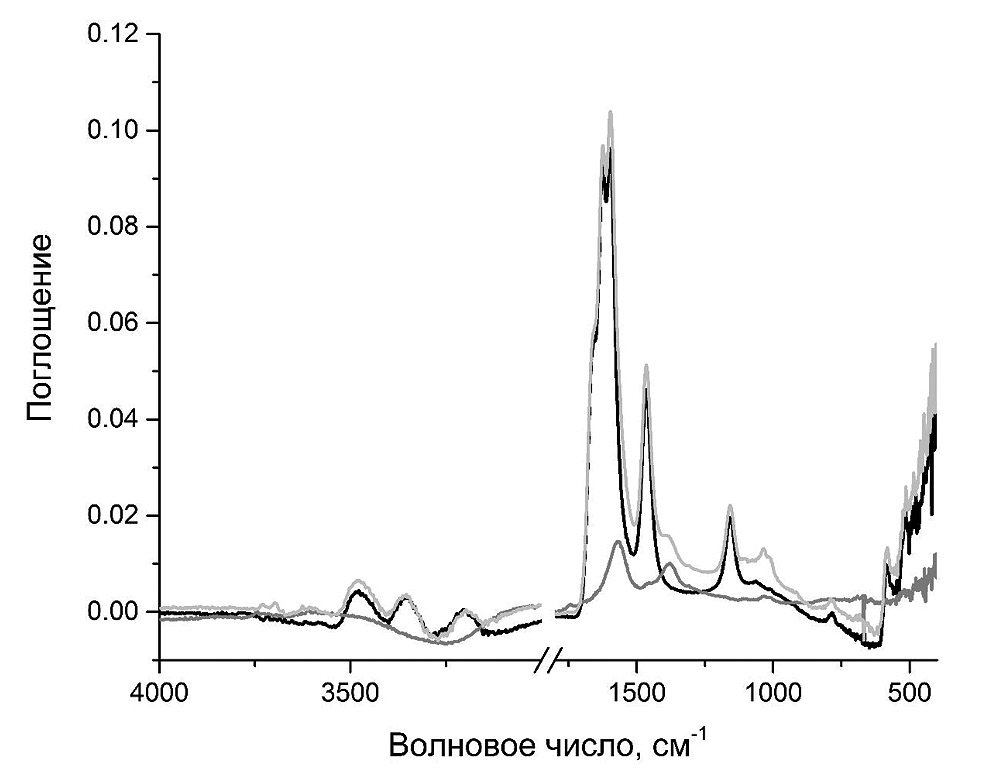 Рис. 2. ИК-НПВО-спектры поглощения водных растворов гумата Powhumus (50 г/л, серая линия), мочевины (100 г/л, черная линия) и их смеси (50 : 100 г/л, светло-серая линия) в средней ИК-области (4000–400 см–1).