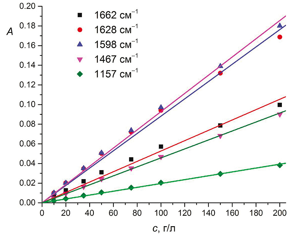 Рис. 3. Градуировочные графики водных растворов мочевины в диапазоне 10–200 г/л для полос 1662, 1628, 1598, 1467 и 1157 см–1.