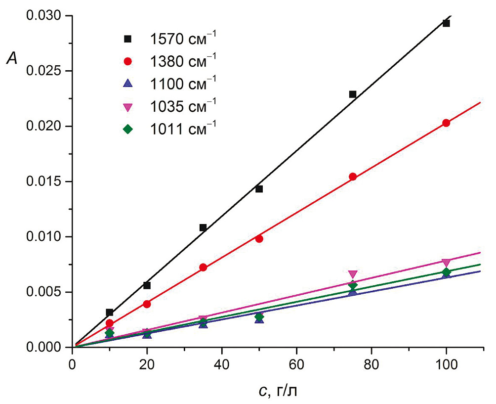 Рис. 4. Градуировочные графики водных растворов гумата Powhumus в диапазоне 10–100 г/л для полос 1570, 1380, 1100, 1035 и 1011 см–1.