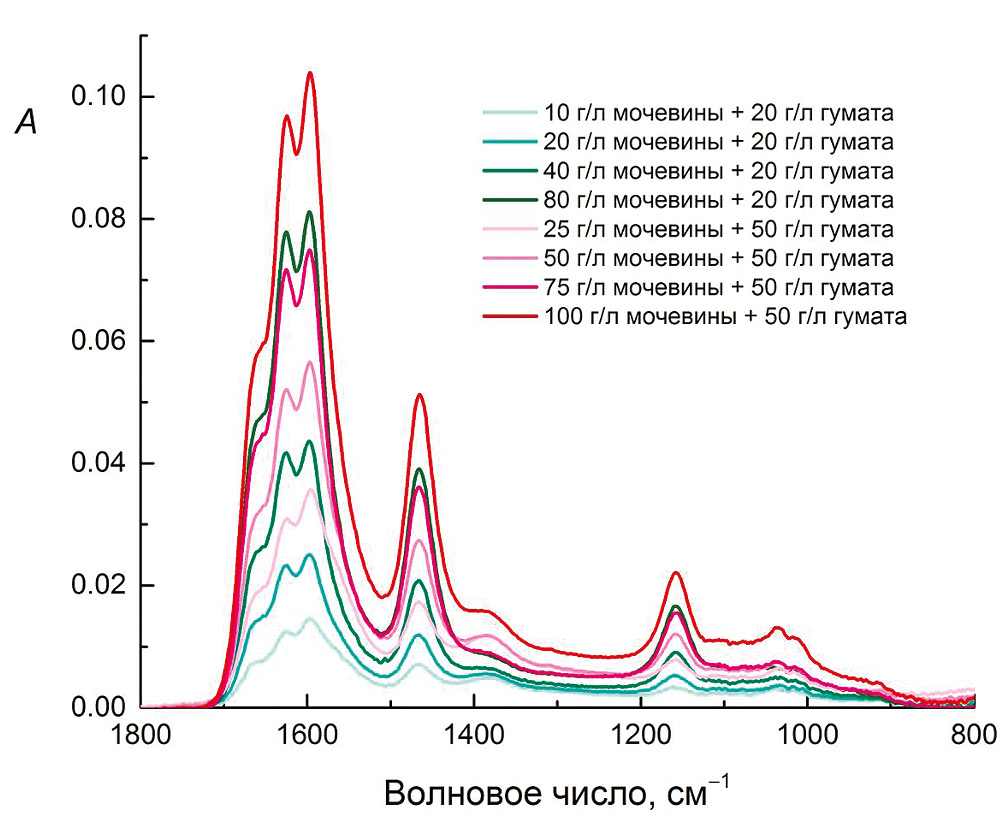 Для количественного анализа выбрали сам ые интенсивные полосы спектра мочевины 1662, 1628, 1598, 1467, 1157 см–1 и гумата 1570, 1380, 1100, 1035, 1011 см–1. Ранее показано на примере лигносульфонатных смесей, что гумат можно определить в смеси с другими соединениями даже при перекрывании характеристических полос [32]. Для этих целей необходимо использовать математические модели при расчетах.