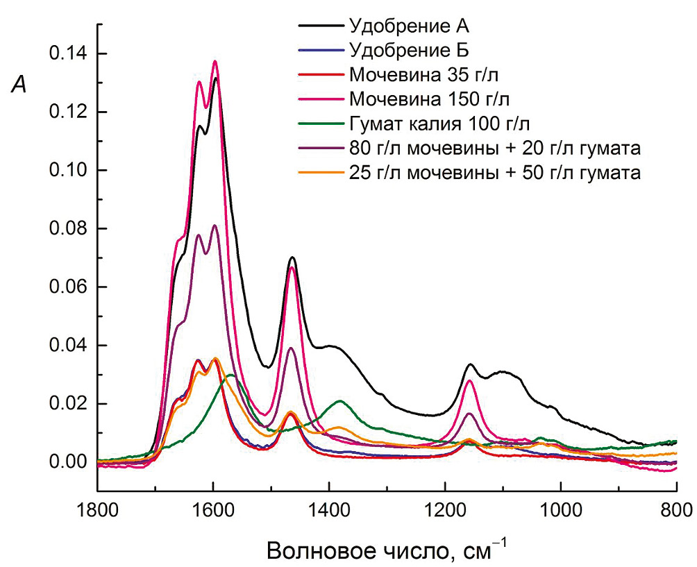 Рис. 6. ИК-НПВО-спектры поглощения жидких удобрений А и Б, водных растворов мочевины и гумата Powhumus в средней ИК-области (1800–800 см–1).